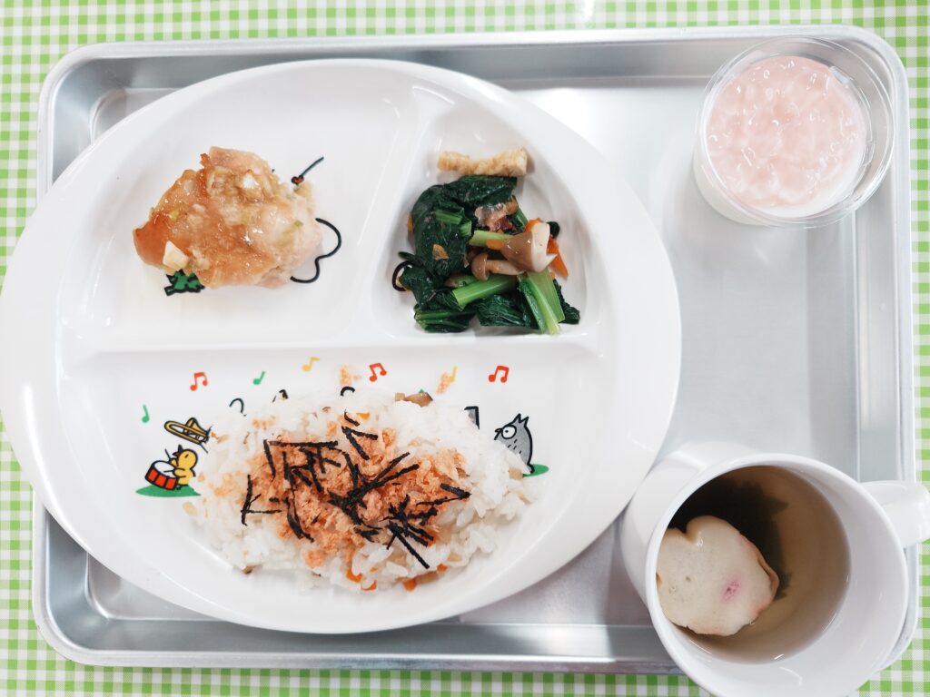 🎎ひなまつりメニュー🎎ちらし寿司、花麩のすまし汁、鶏肉のねぎ味噌焼き、小松菜ときのこのお浸し、ひなまつりゼリー