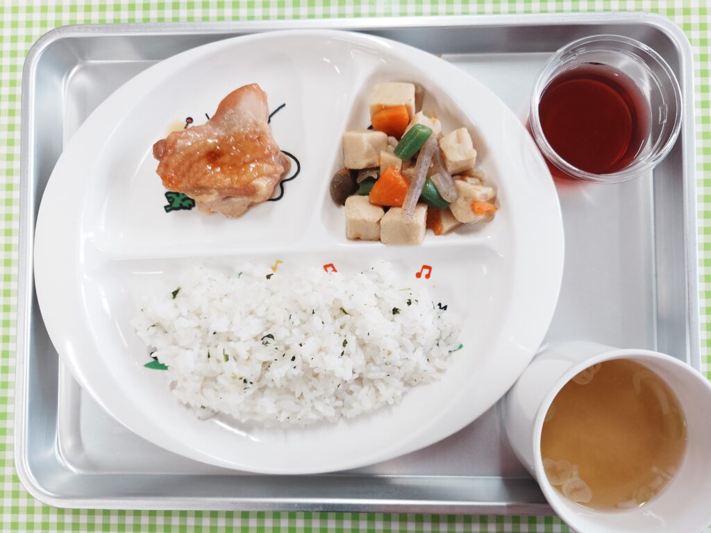 菜めし、じゃがいもの味噌汁、鶏の照り焼き、高野豆腐の煮物、グレープゼリー