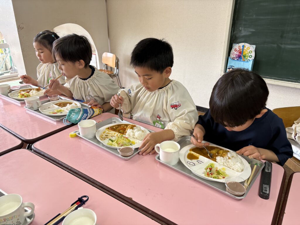 給食では、温かいカレーライス、チョコレートプリンなど残さず全員が完食することができました。
