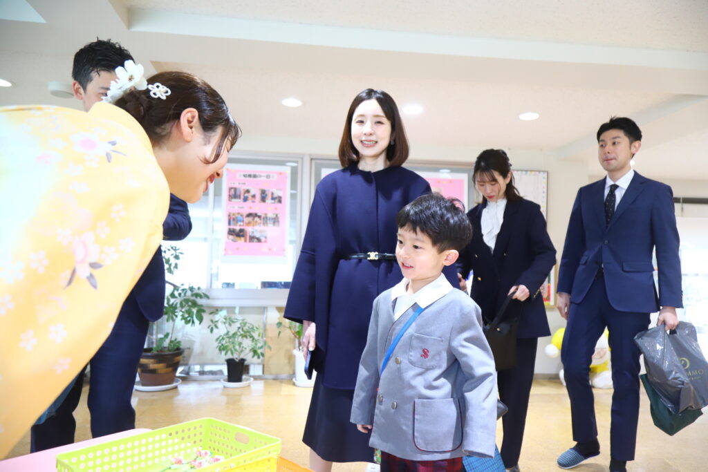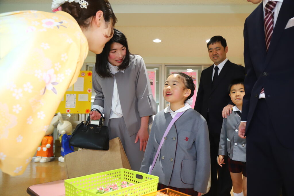 登園すると、担任の先生から胸にかわいらしいコサージュをつけてもらい、笑顔になる姿がたくさん見られました。