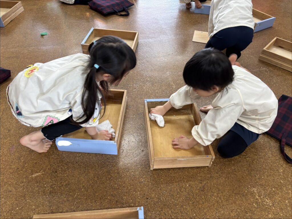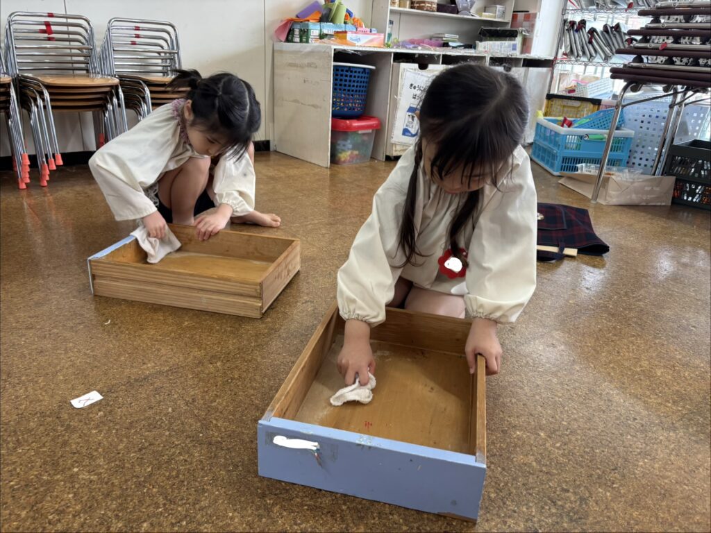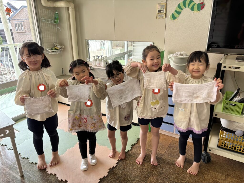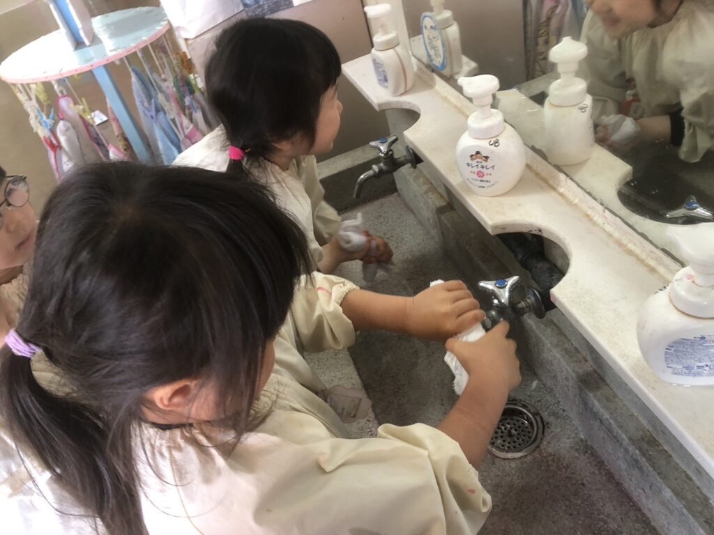 自分たちで雑巾をしぼり、水気を切って準備をします。