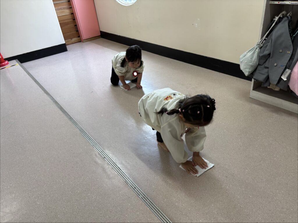 両手をしっかりと床につき、腕を伸ばして一生懸命雑巾がけをする子どもたち。