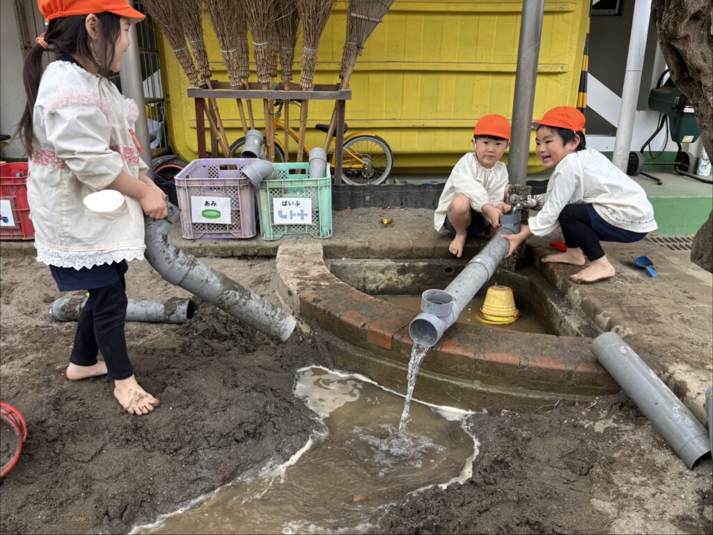 自由遊びの時間には戸外で遊び、他学年の友達を誘ってかくれんぼをしたり、砂場で川を作ったり、長縄や自転車をしたりと元気いっぱい体を動かして遊びました。