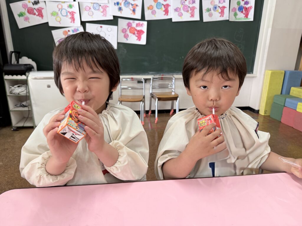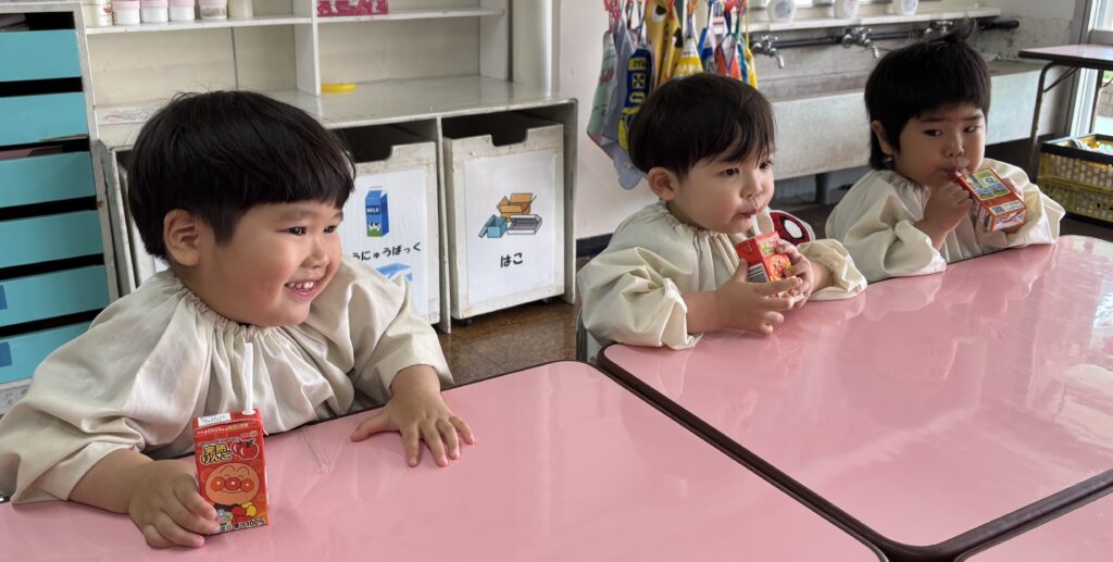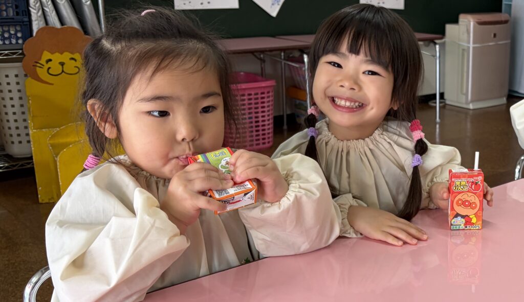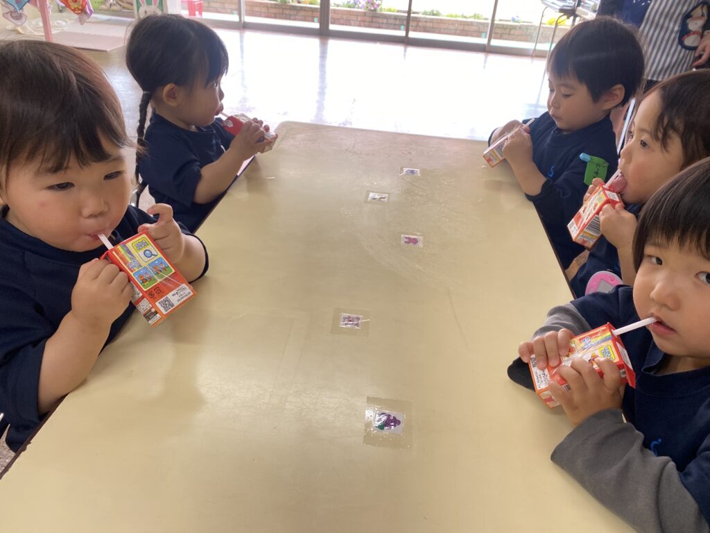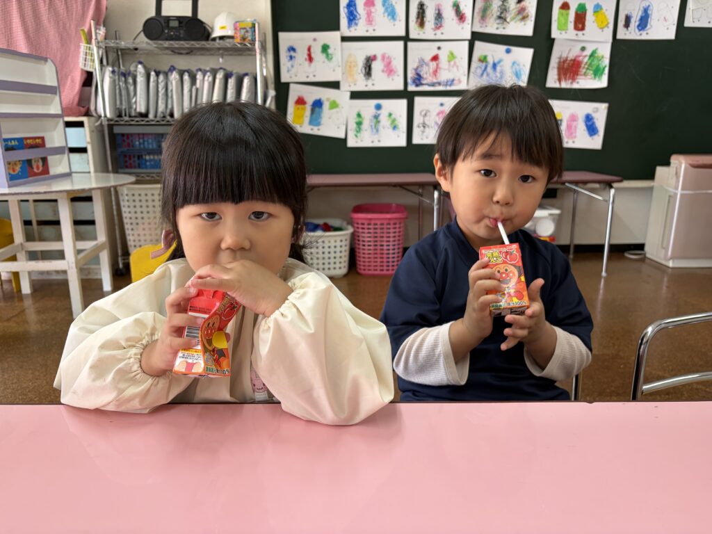 今日はアンパンマンのりんごジュースをみんなでいただきました。