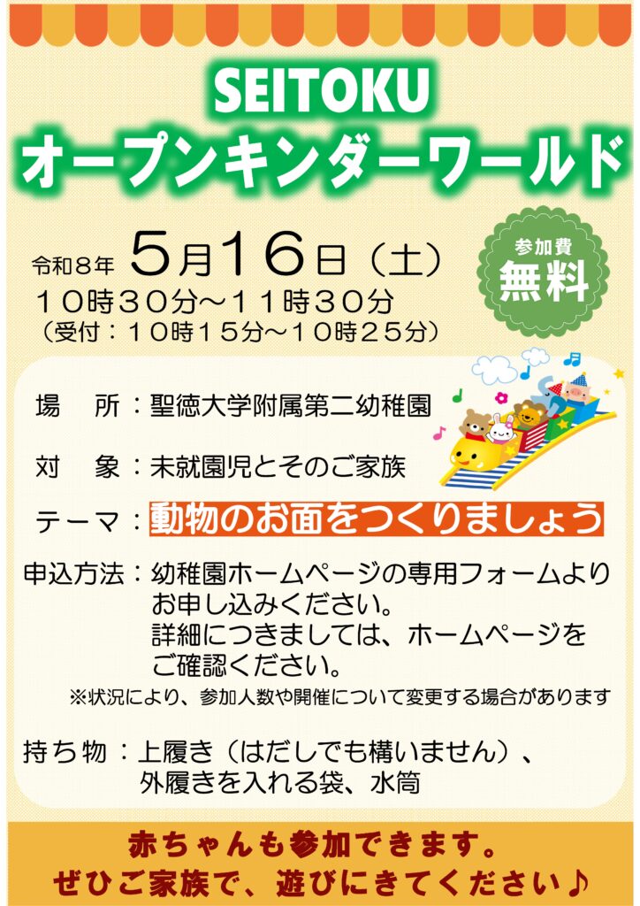5月16日(土)は、動物のお面がつくれる『SEITOKUオープンキンダーワールド』を開催します♪