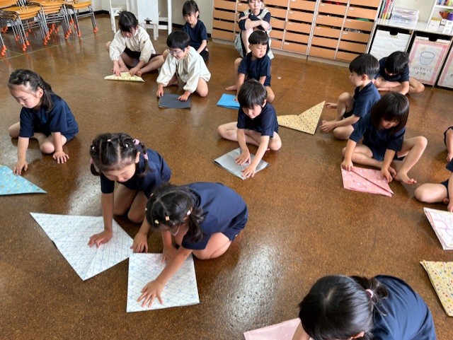5歳児松組は、大きな包装紙を床に広げて折りました。
