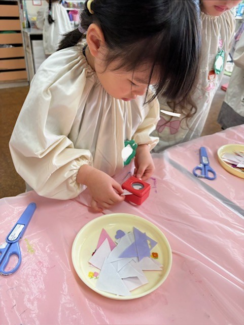折り紙を折って切って、穴あけパンチでハートの形を抜きます。
