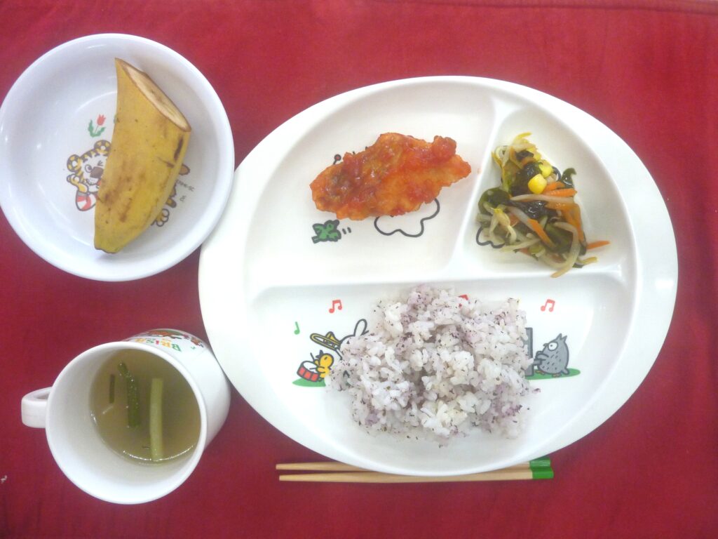 9/30 🐔ご飯・青梗菜の中華スープ・揚げ鶏の甘酢ネギソース・キャベツの中華風和え物・フルーツミルク寒天🐔