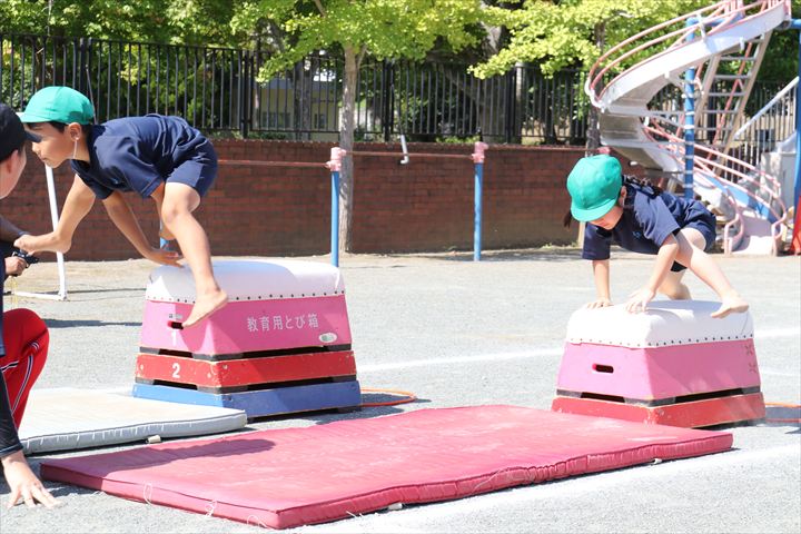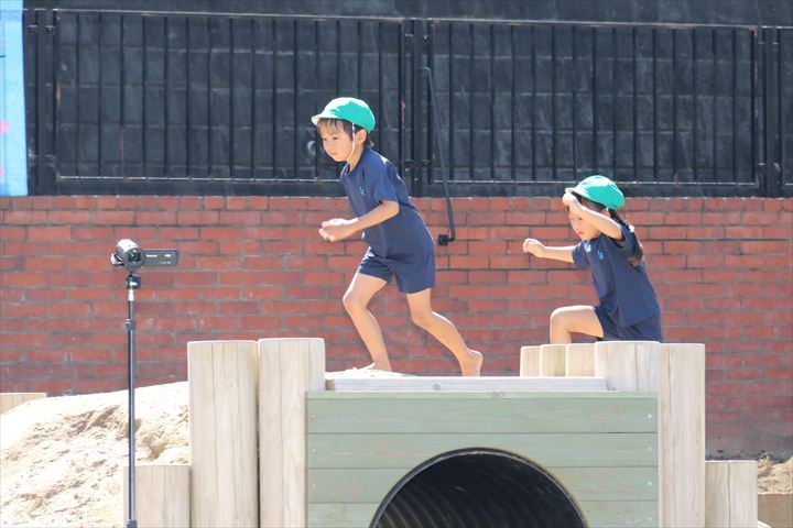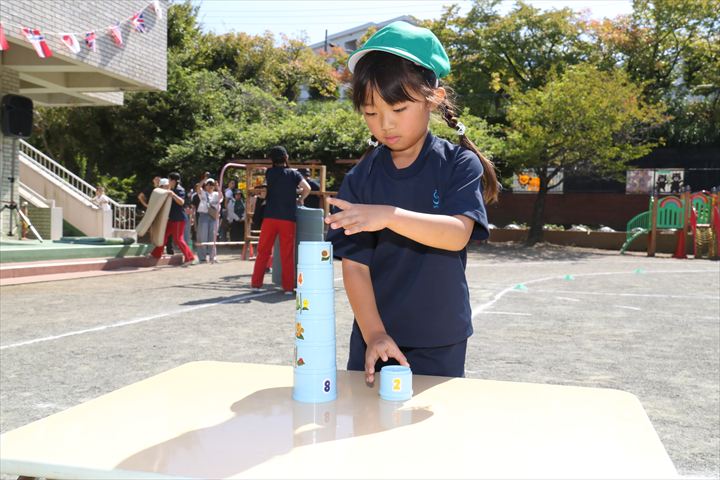障害物競走『ちびっこアドベンチャー』では、跳び箱やウッドジムへのよじ登りや跳び降りをして、一つひとつの競具の約束を守り最後まで諦めずに挑戦しました!今回初めて競技に取り入れた『ひまわりタワー』🌻学年ごとにタワーの重ねる段数を変えて挑戦しましたよ。松組は8段のタワーを作ります!ひまわりタワーを初めて行なったときには、タワーを作るのも片付けるのも時間が掛かっていました。繰り返し経験をすると早く出来るようになり、運動会当日もスムーズにタワーを作っていましたね☆