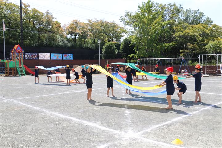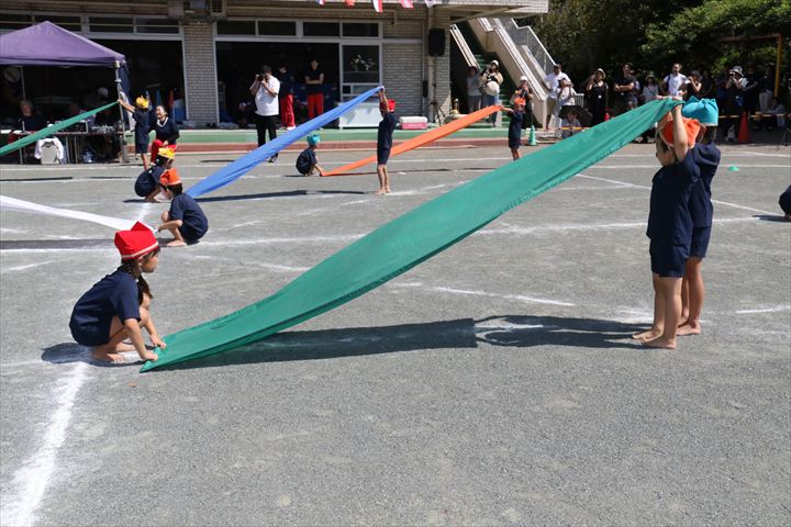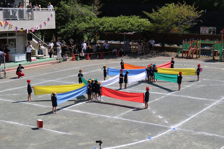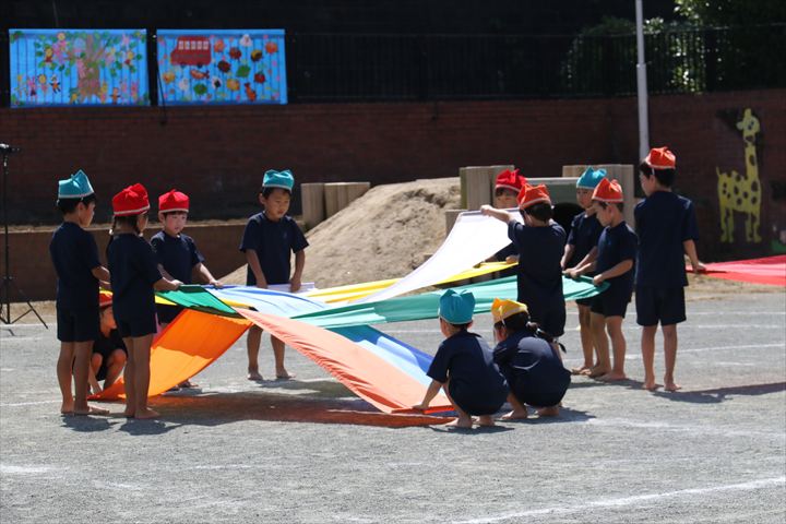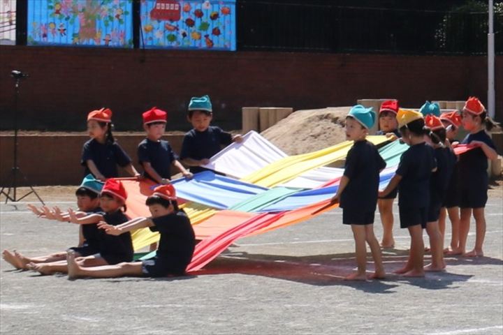 運動会当日のマスゲームも、友だちと気持ちを合わせて隊形を移動させたり、パラウェーブで様々な技を行ない、最後まで笑顔で楽しく取り組むことが出来ましたね✨マスゲームが終わった後に「楽しかったね!」「上手に出来たの、ママたち見てたかな?」と友だちと達成感を味わい話していましたよ🌈