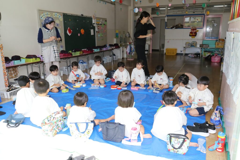 みんなで手を合わせてご一緒に『いただきます!』🤗お部屋にシートを敷いてみんなで食べました!だんだんとお日様も出てきてポカポカピクニック気分💕おうちの方が作ってくれたご飯おいしかったね!!素敵な思い出が出来て良かったですね😆