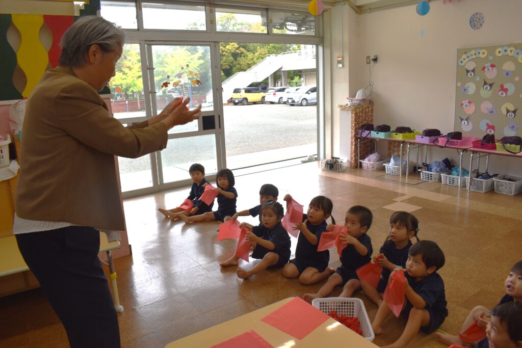 園長先生と一緒にさくら紙を丸めたり、貼ったりしましたよ😊