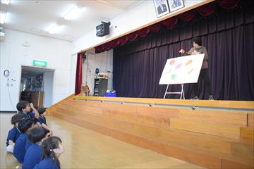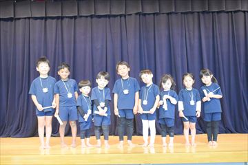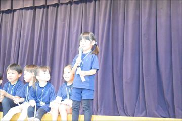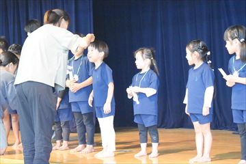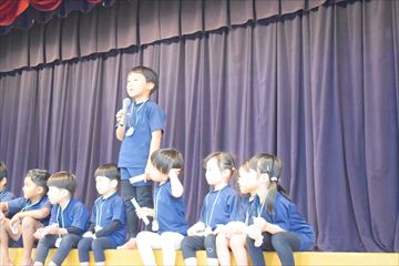 幼稚園の遊戯室に全園児が集まり、拍手で10月生まれのお友だちを迎えました。