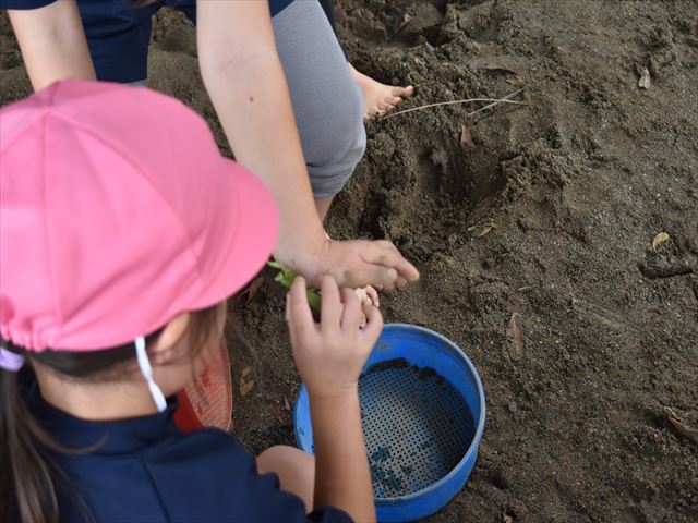 手で持ったり、ざるに置いてみたり・・・。でも最後は、逃がしてあげましたよ💕
