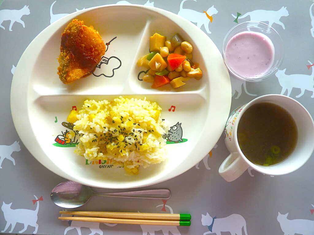 11/12 🍴サツマイモごはん・もずくの味噌汁・白身魚のフライ・五目豆・ブルーベリーヨーグルト🍴