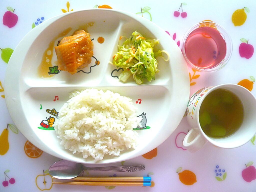 11/13 🍓ごはん・小松菜の味噌汁・鶏肉の照焼・素麺サラダ・イチゴゼリー🍓