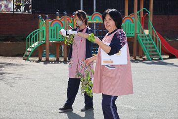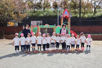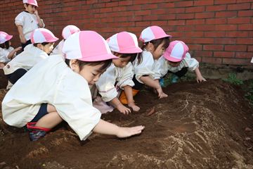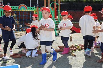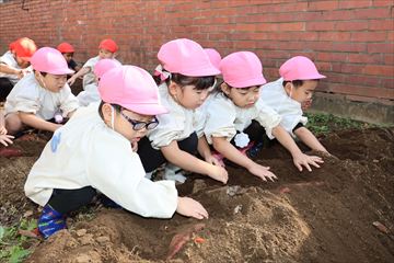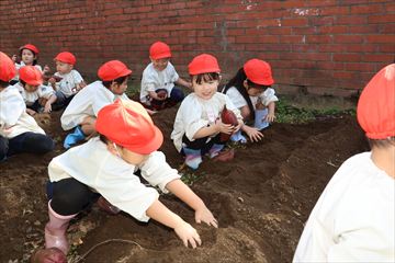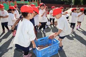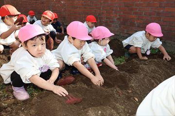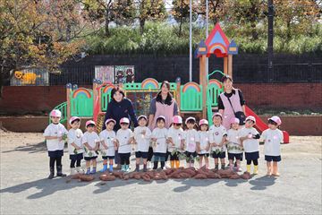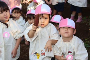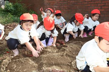 11月4日(火)に満3歳児パンダ組、3歳児桜組、4歳児梅組の幼児がさつまいも掘りをしました。