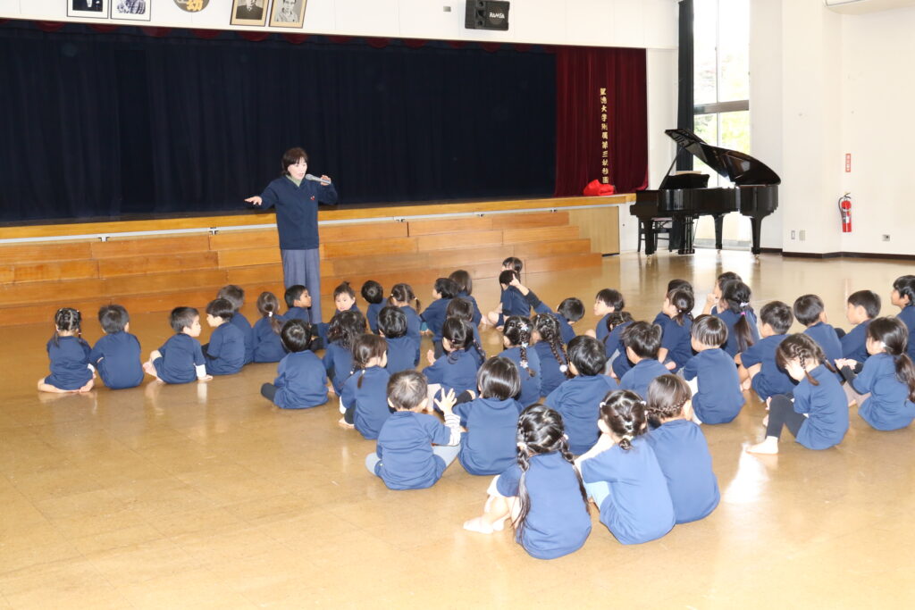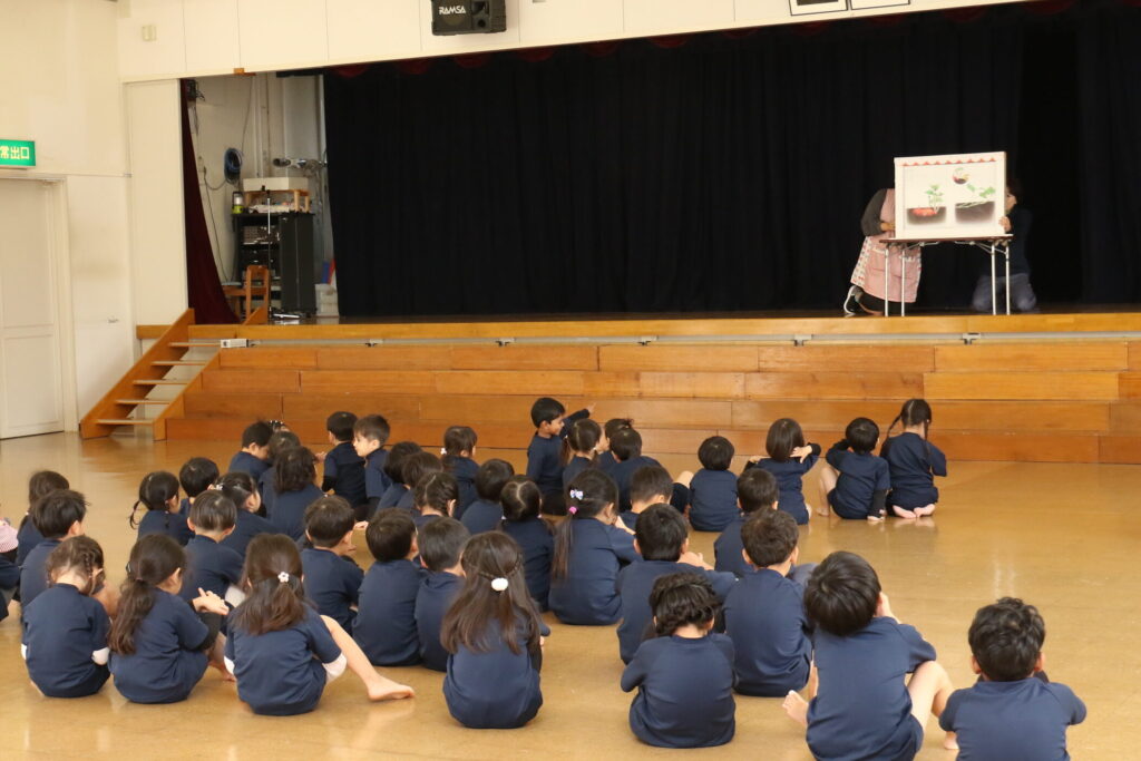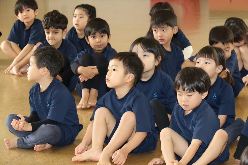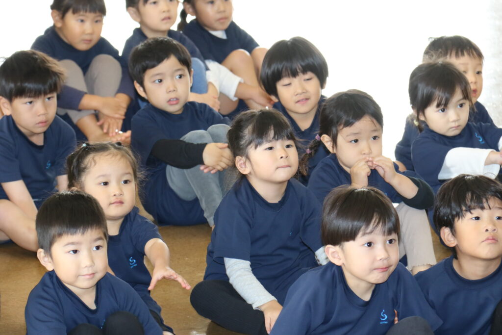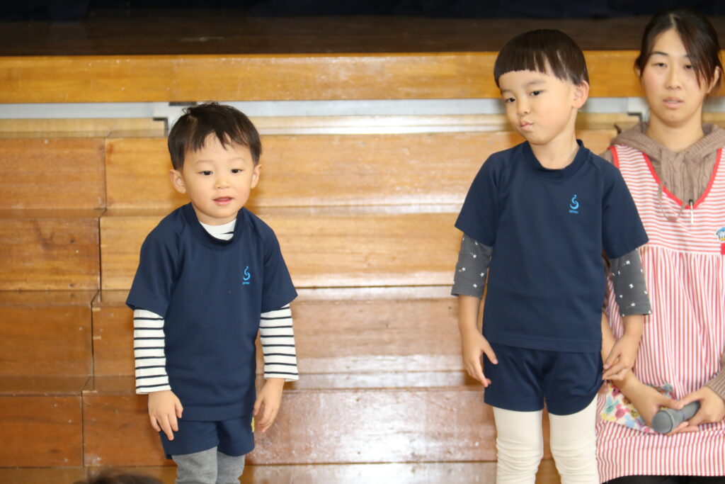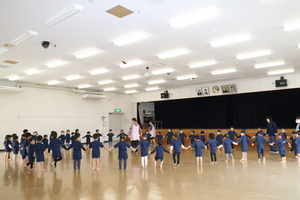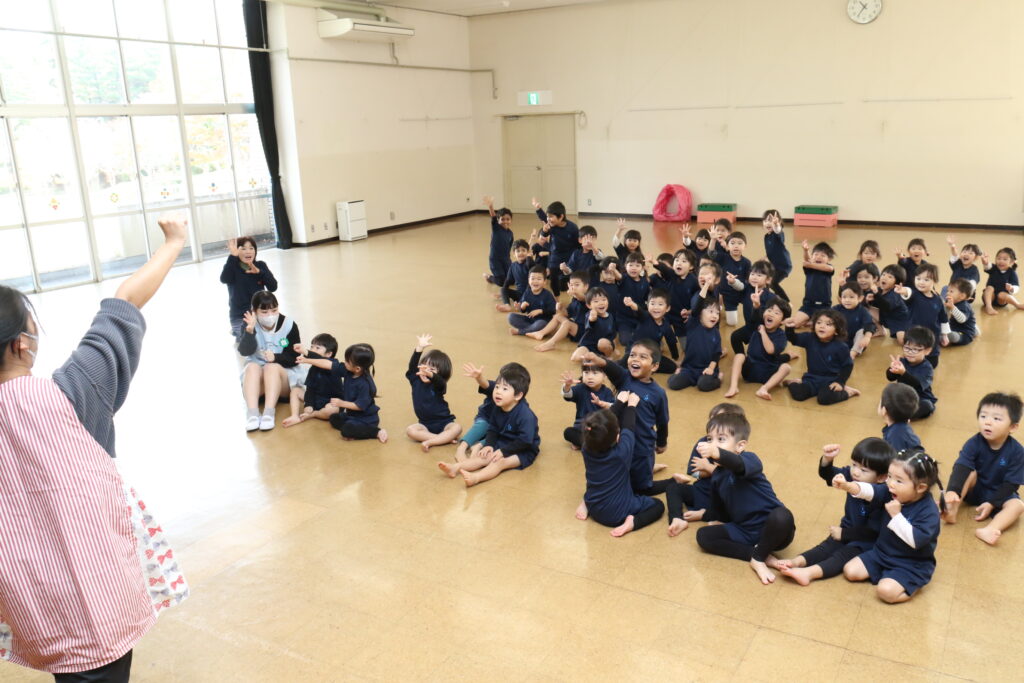 広~い遊戯室に梅組(4歳児)、桜組(3歳児)、パンダ組(満3歳児)のお友だちが集まりました✨