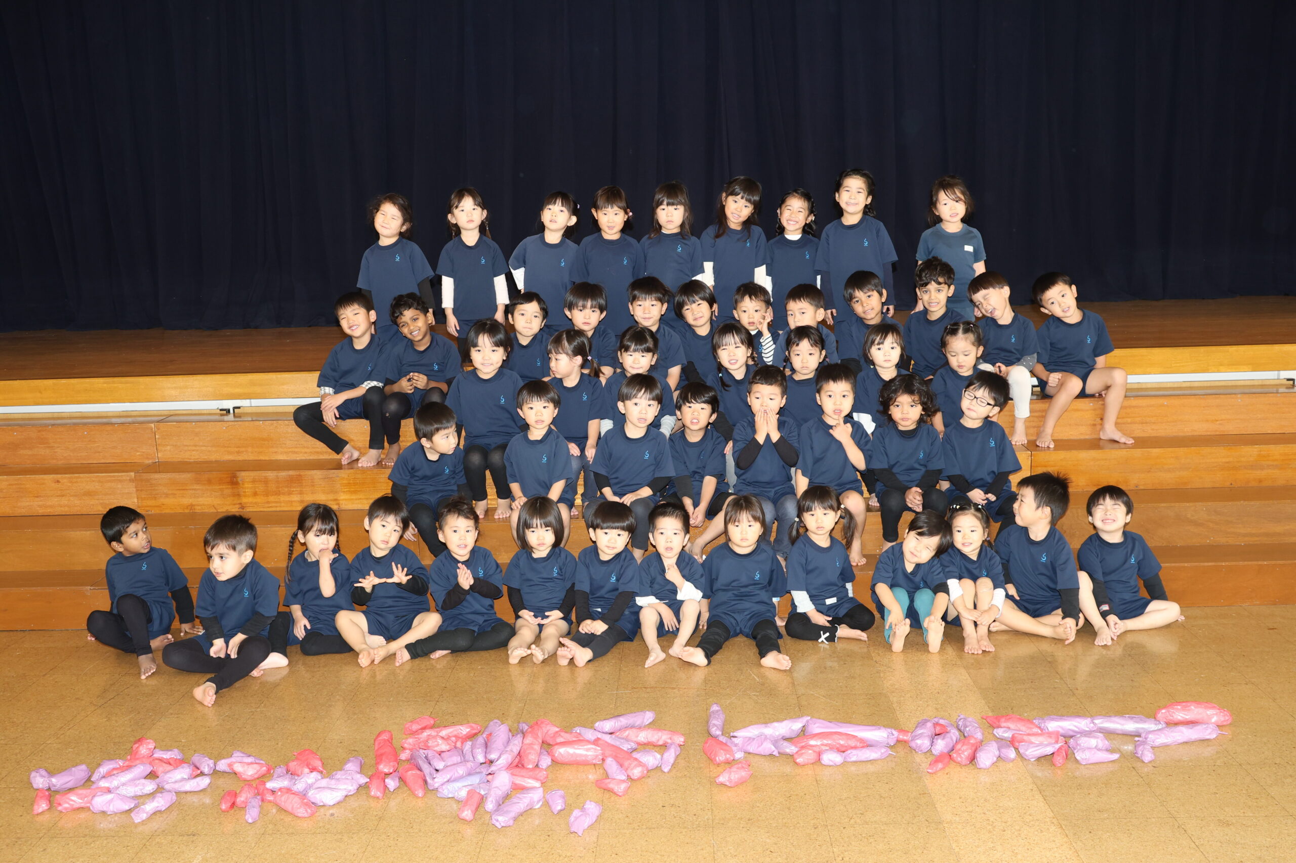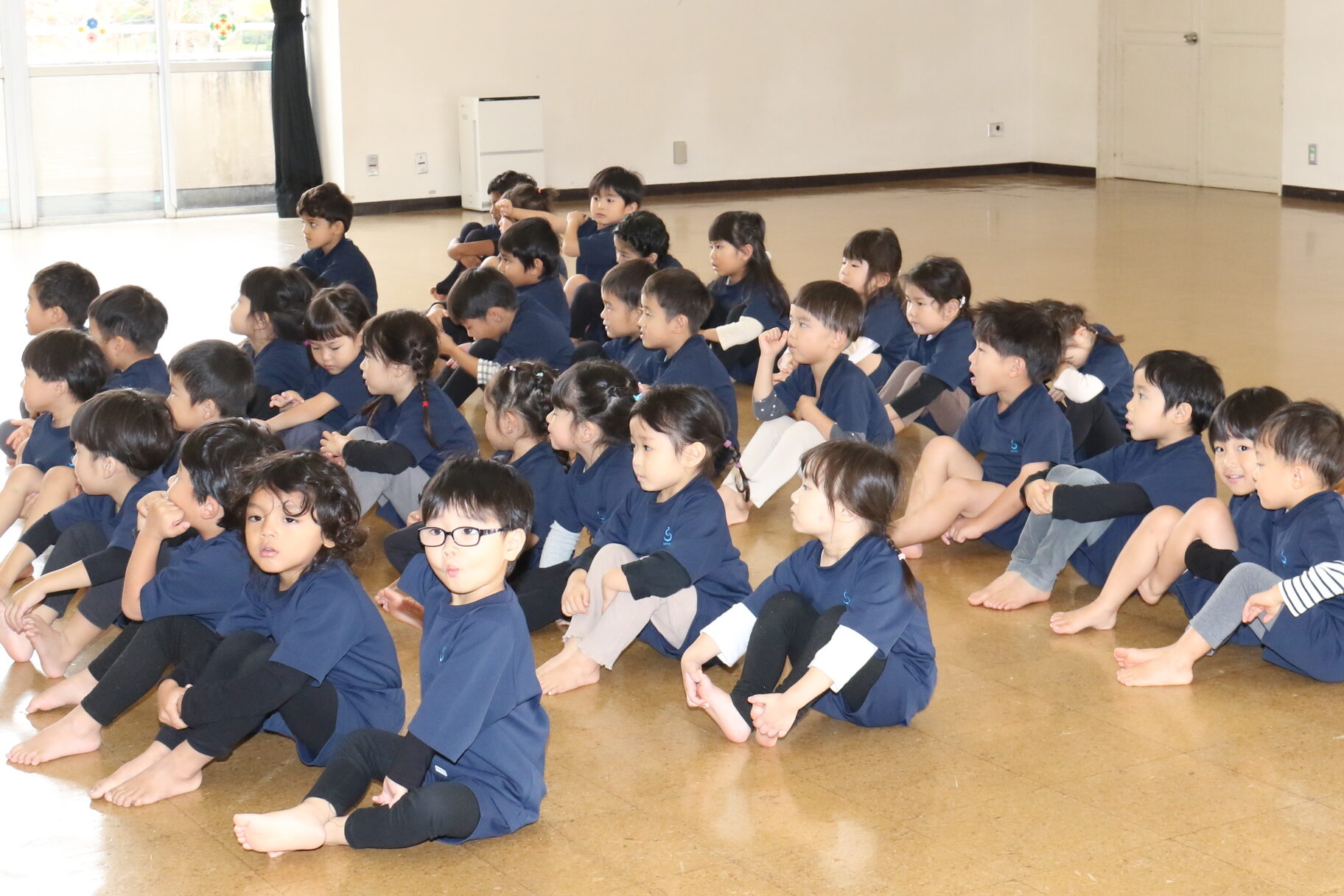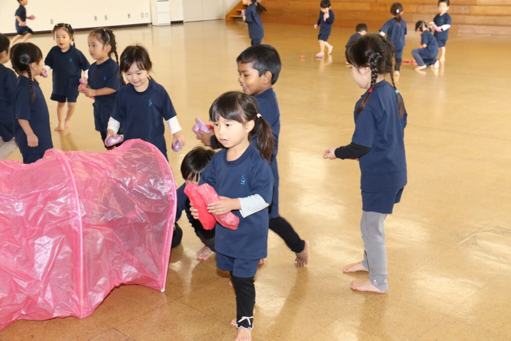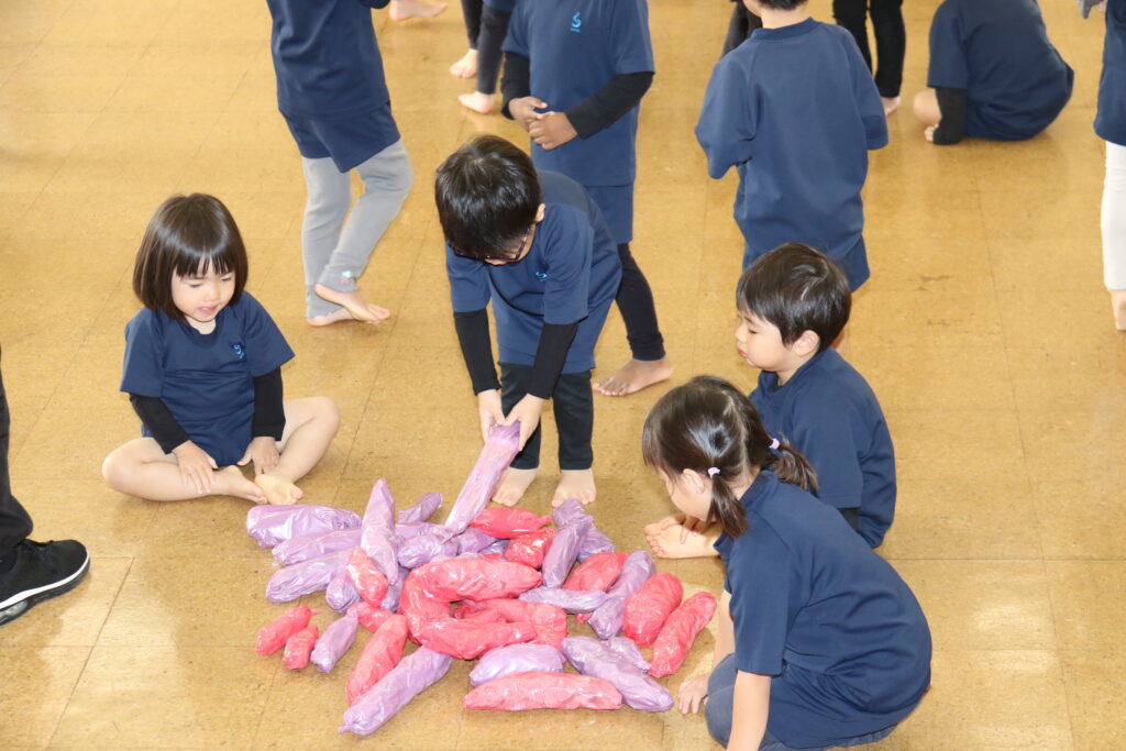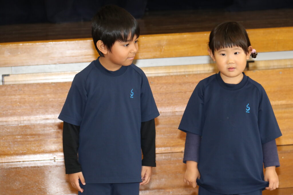 広~い遊戯室に梅組(4歳児)、桜組(3歳児)、パンダ組(満3歳児)のお友だちが集まりました✨