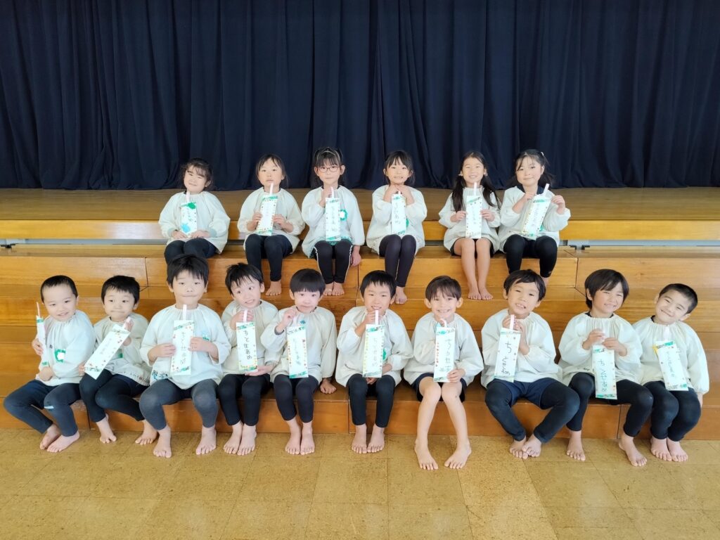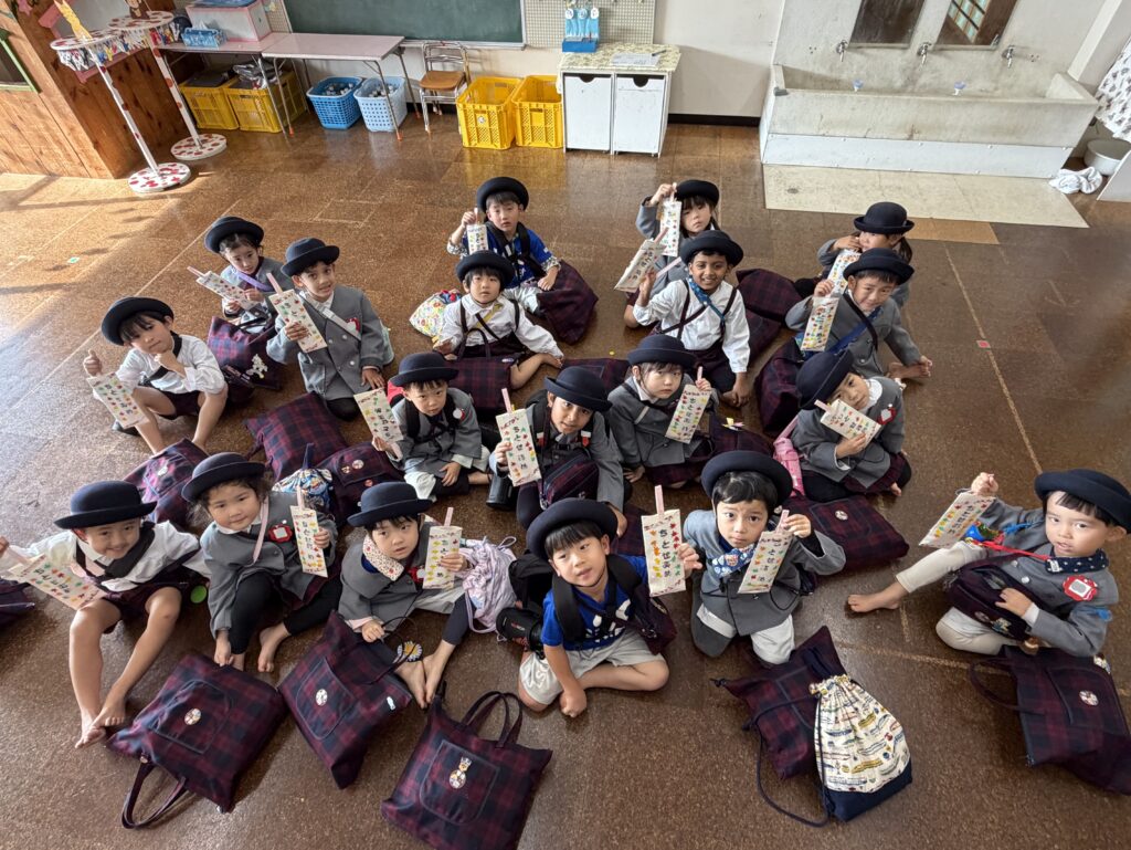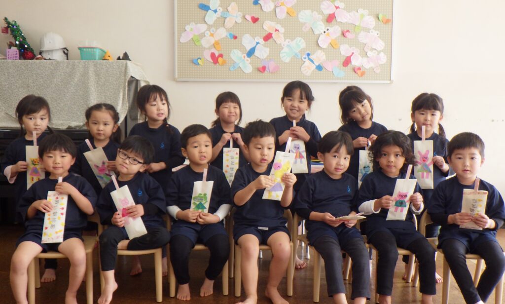 自分たちで飾り付けをした袋に千歳飴が入っていることを聞くと、「ちとせあめ?」「知ってる!赤と白のだよね!」と友だちや先生と話していました。