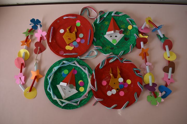 紙皿に穴をあけて毛糸を通し、クリスマスリースを作りましたよ🎄