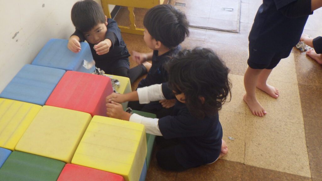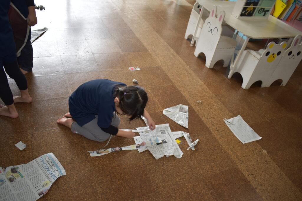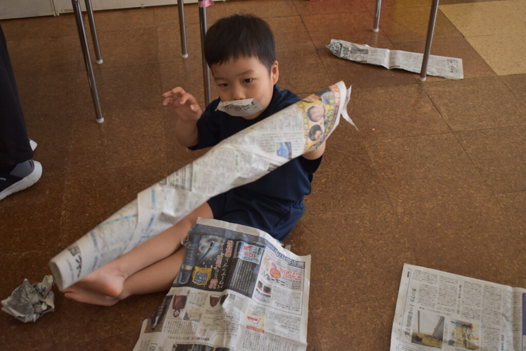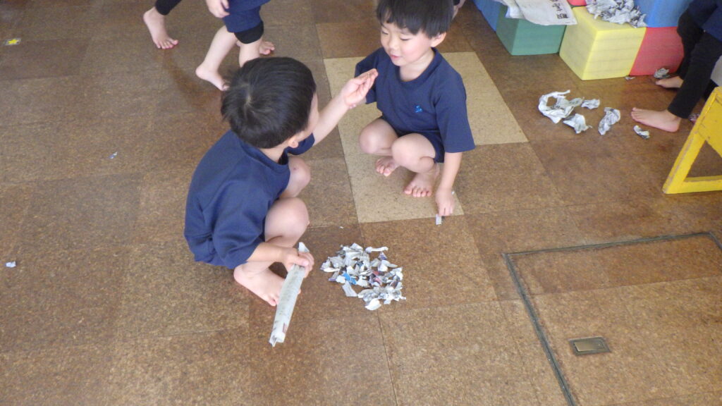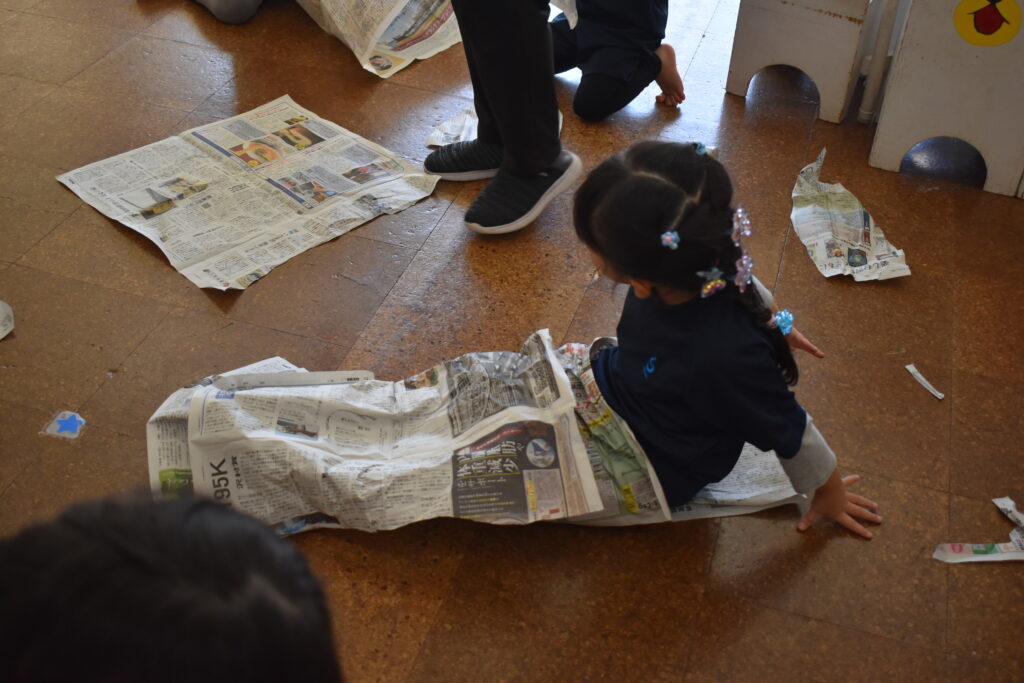 年少・桜組の子ども達は、新聞紙を使って遊んでいます📚