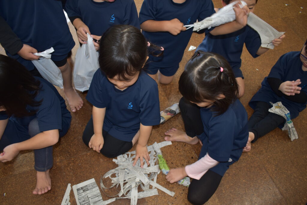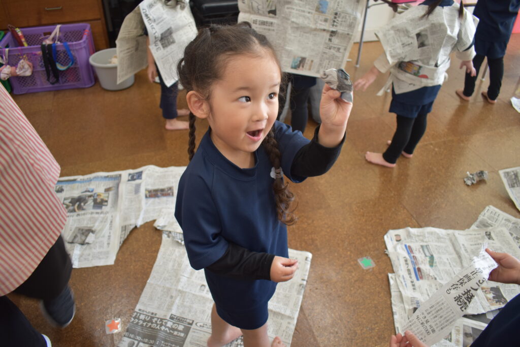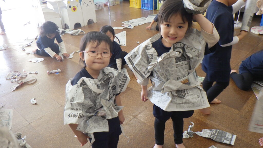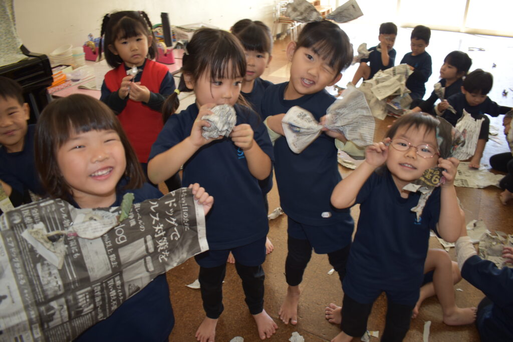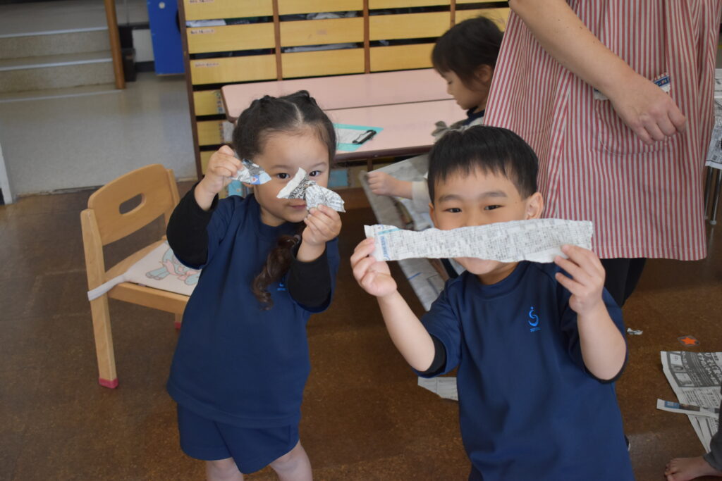 桜組の子ども達は、新聞紙を扱う指先の器用さだけでなく、想像力や発想力も育っています💕