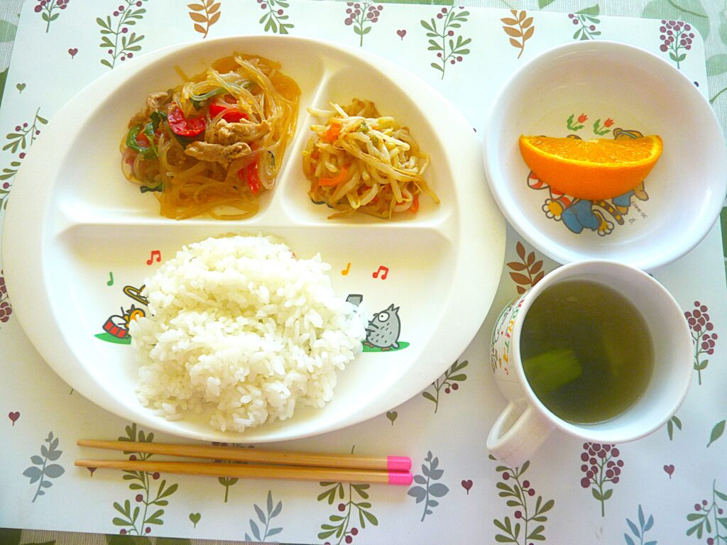 12/15🍚ご飯・青梗菜の中華スープ・チャプチェ・もやしのナムル・オレンジ🍚