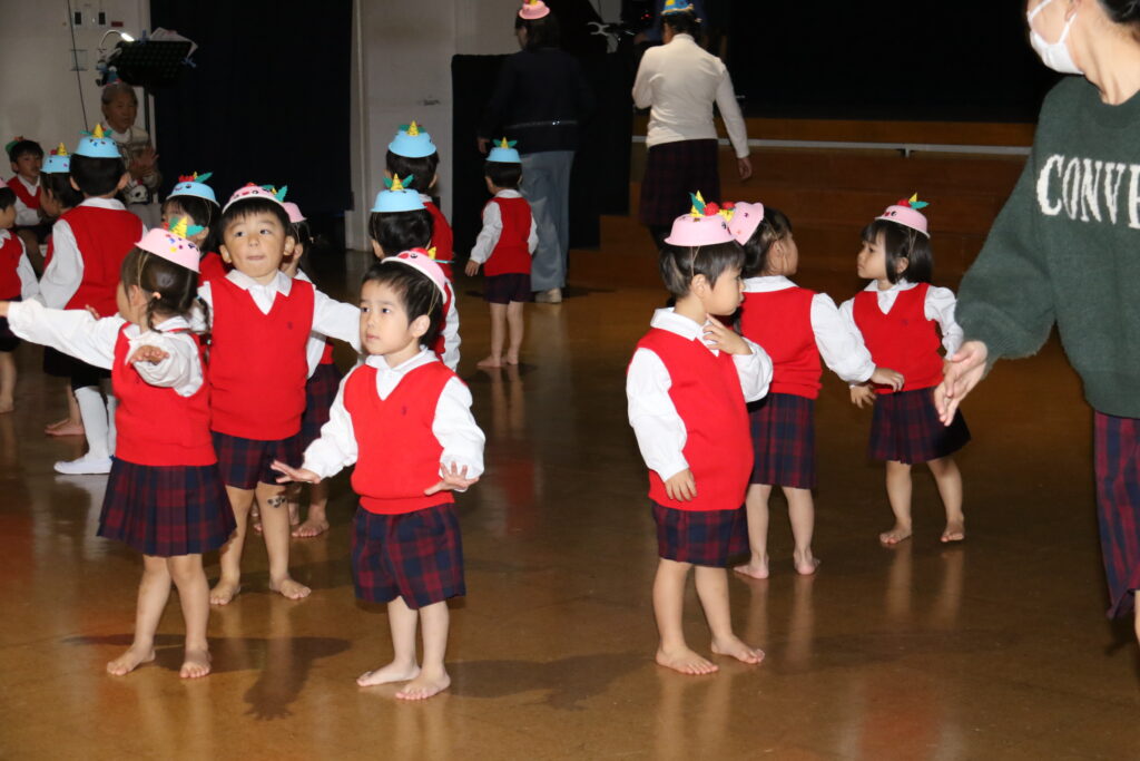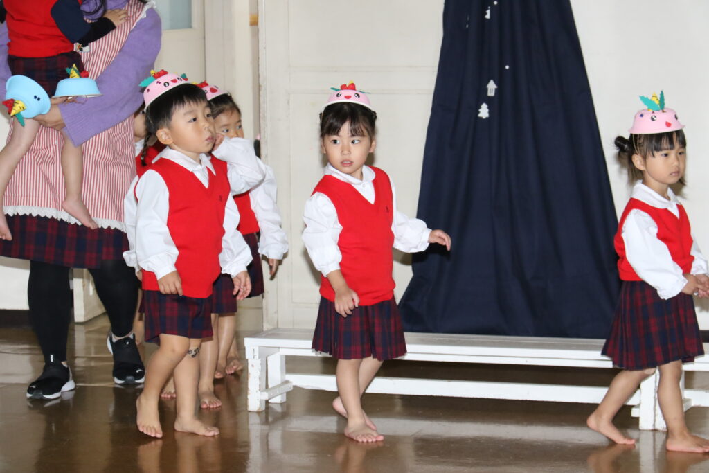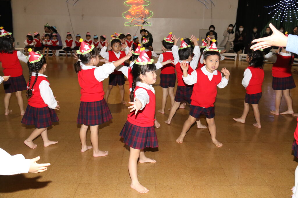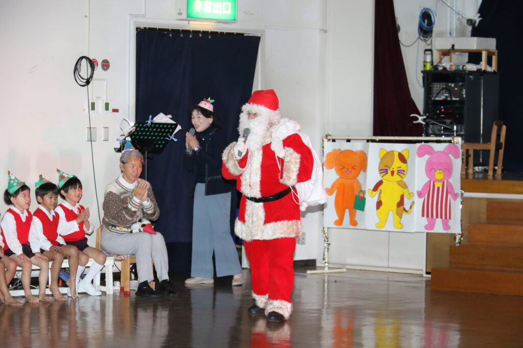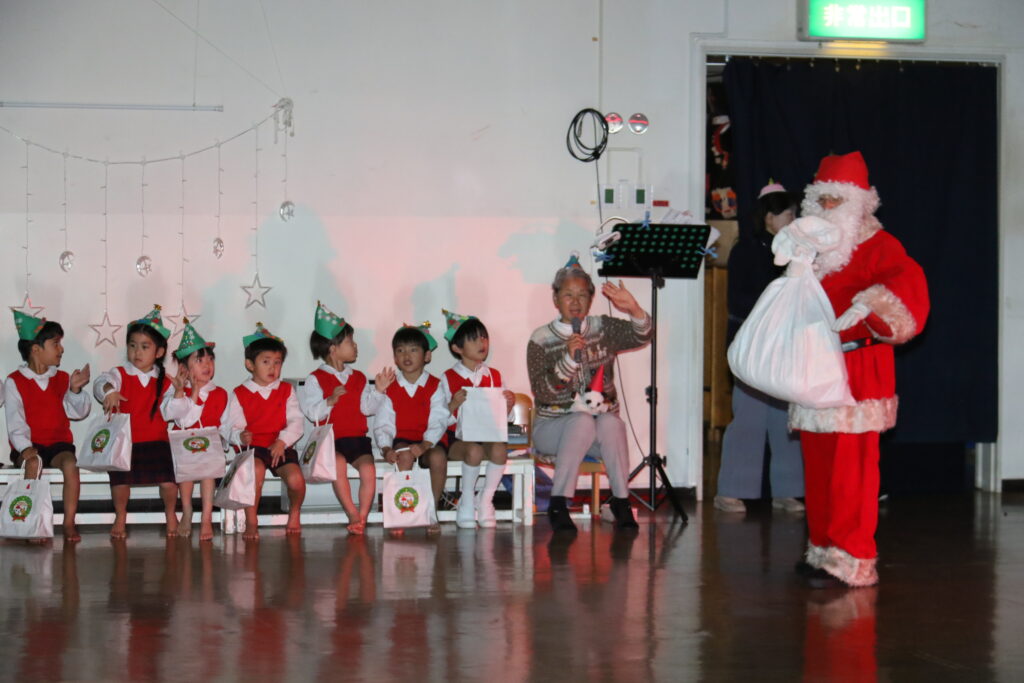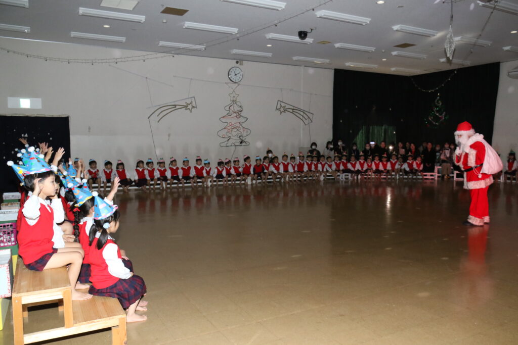 みんなで歌ったり、踊ったり、合奏をしたり楽しく過ごせましたね!先生方の劇を見て、サンタさんって「どんな人かな」とみんなで答え合わせをしていると・・・シャンシャン🎵鈴の音が聞こえてきて、サンタさんが来てくれました🎅サンタさんと握手をしたり、すてきなプレゼントをもらって大喜び😍