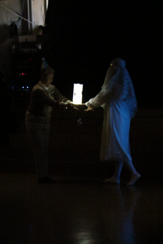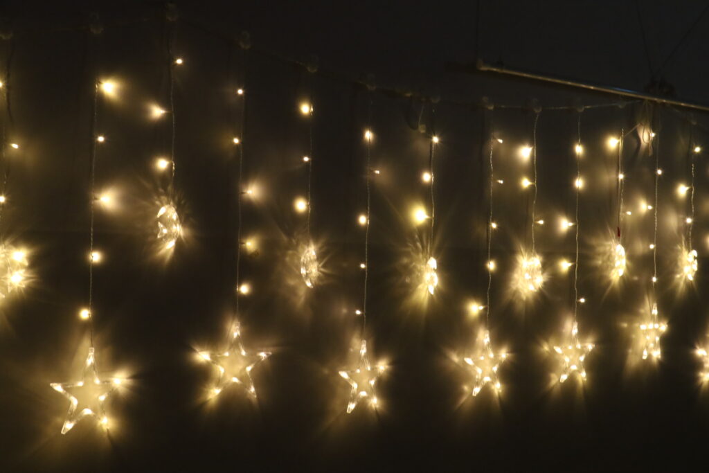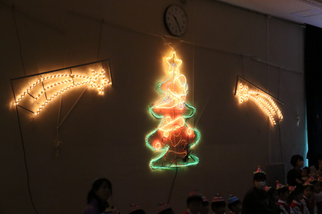 遊戯室にみんなが集まると、天井やツリーがきらきらとひかりはじめました✨
