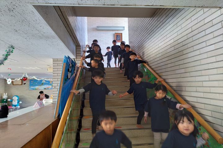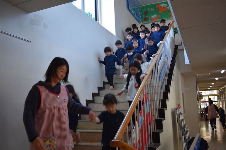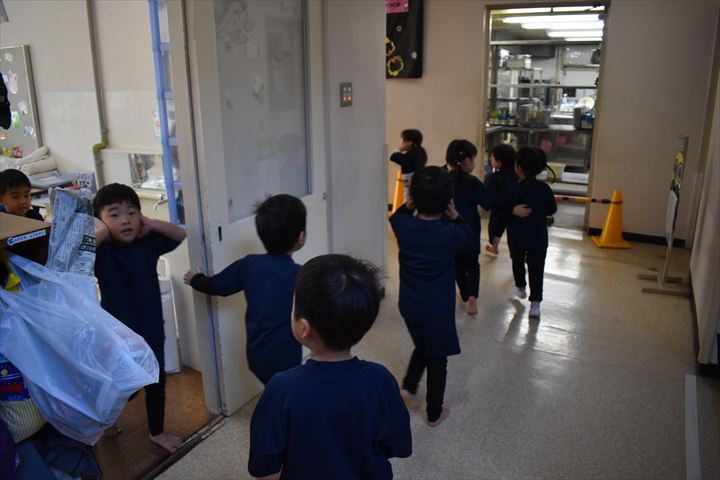 放送が流れて園庭から不審者が来たことが分かると、みんなで玄関に避難しましたよ😖💦