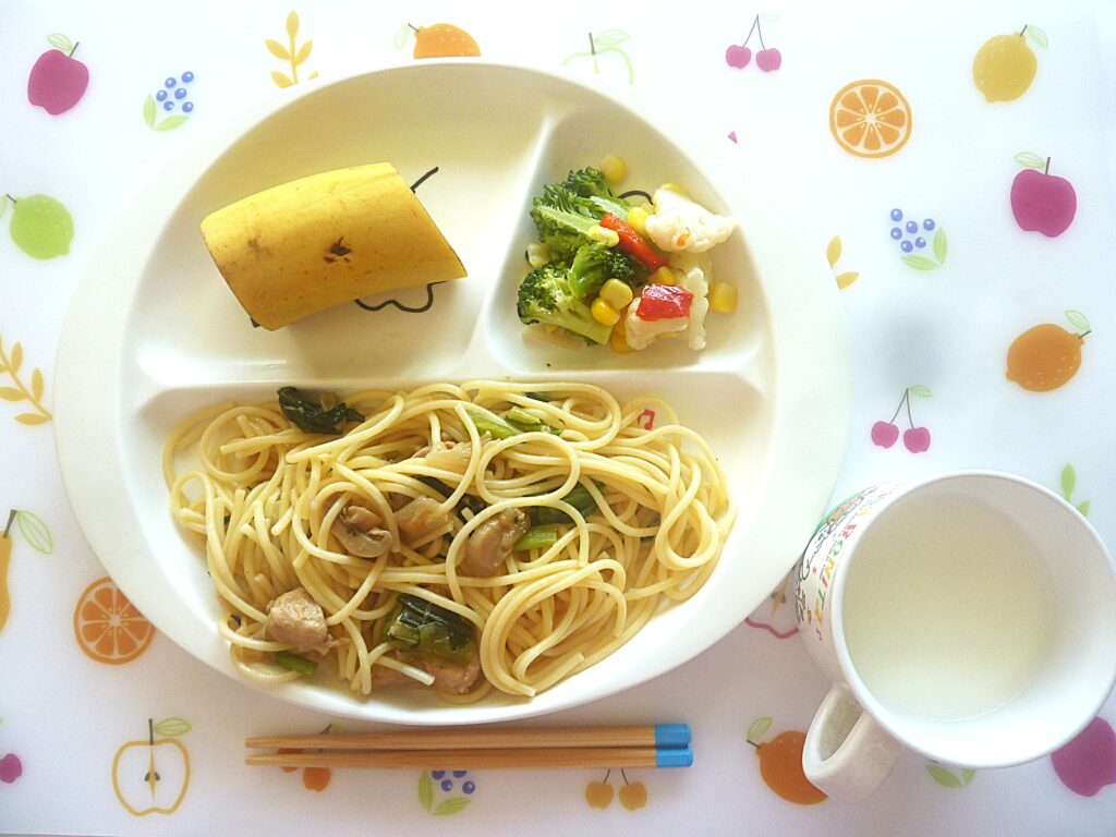 1/16 🍌鶏肉と小松菜の和風スパゲッティ・ミルク・ミックスサラダ・バナナ🍌