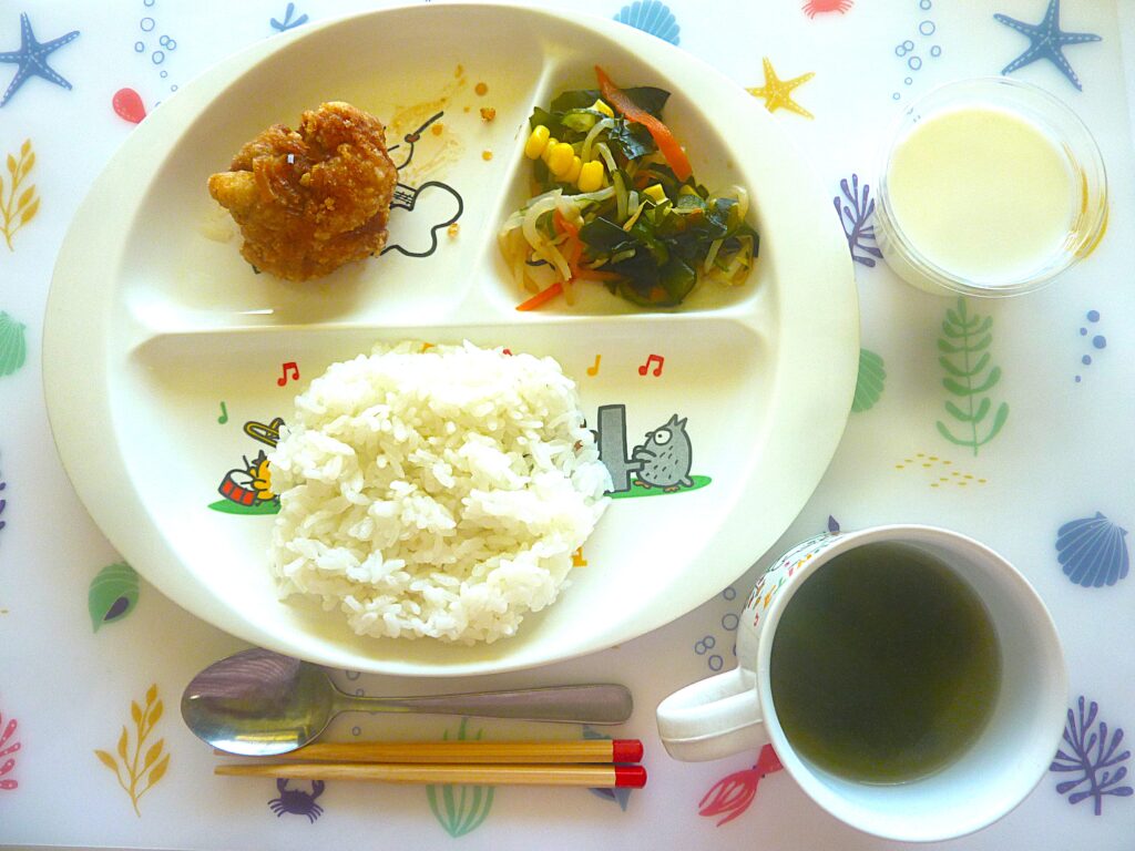 1/29 🥢ご飯・青梗菜のスープ・揚鶏の甘酢葱ソース・中華風わかめサラダ・ミルク寒天🥢