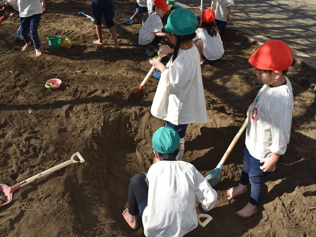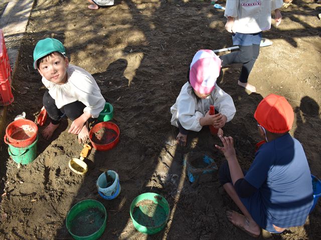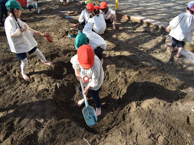 砂場では…穴を掘って、そこに階段を作ったり、注文を聞いてジュースやケーキを作ったり・・・