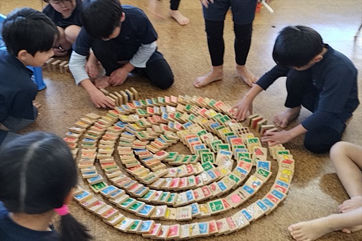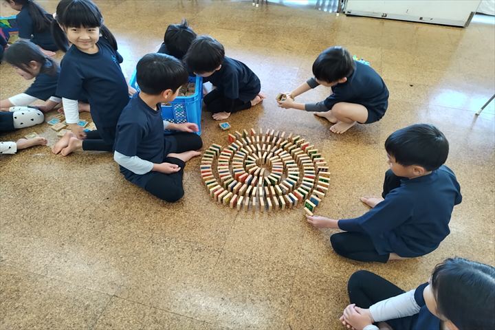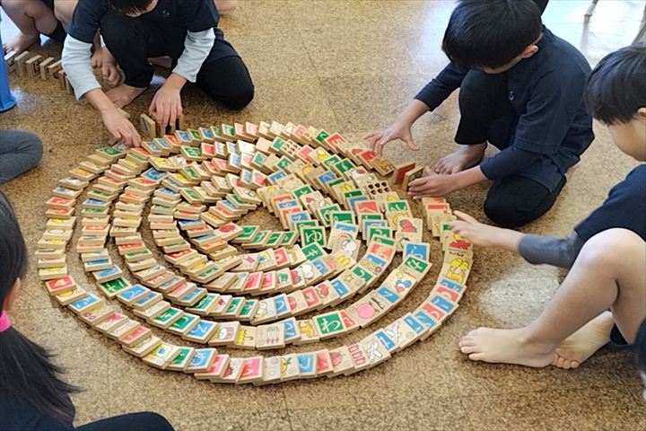 縦に並べたり、ぐるぐる渦巻きにして並べたり・・・完成すると、「ねぇ、見て!」「大きいのが出来た!」と言って、友だちや先生にドミノが出来たことを伝えに行きます。