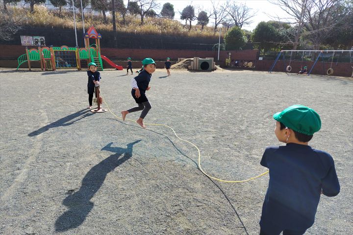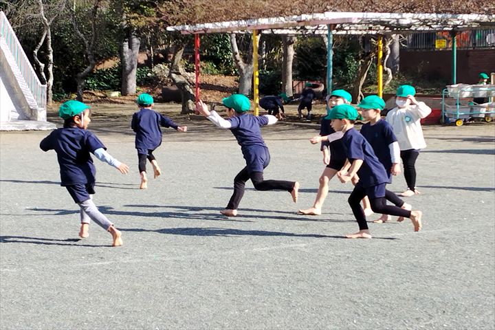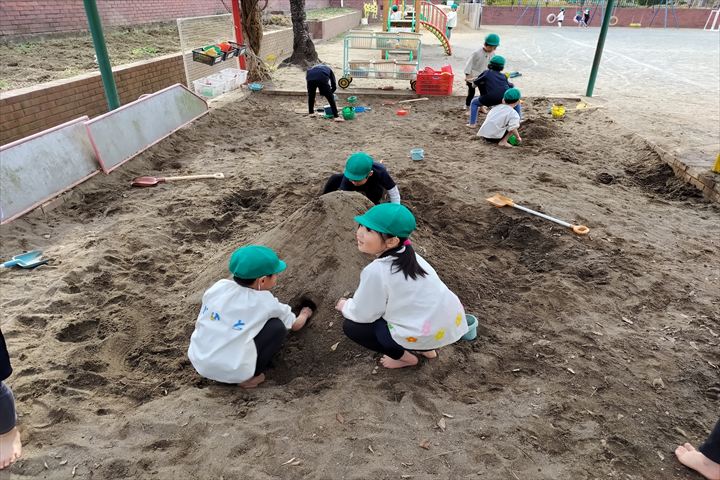 いつも園庭で鬼ごっこをしたり、遊具で遊んだり、砂場で山や川を作ったりして活発に遊んでいます!