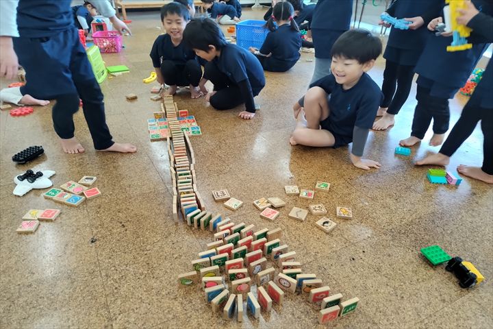 積み木を並べて倒れる様子を楽しむだけではなく、どうしたら倒れるか、どんな形のドミノを作ろうか・・・と友だちと工夫しながら遊んでいましたよ🌀