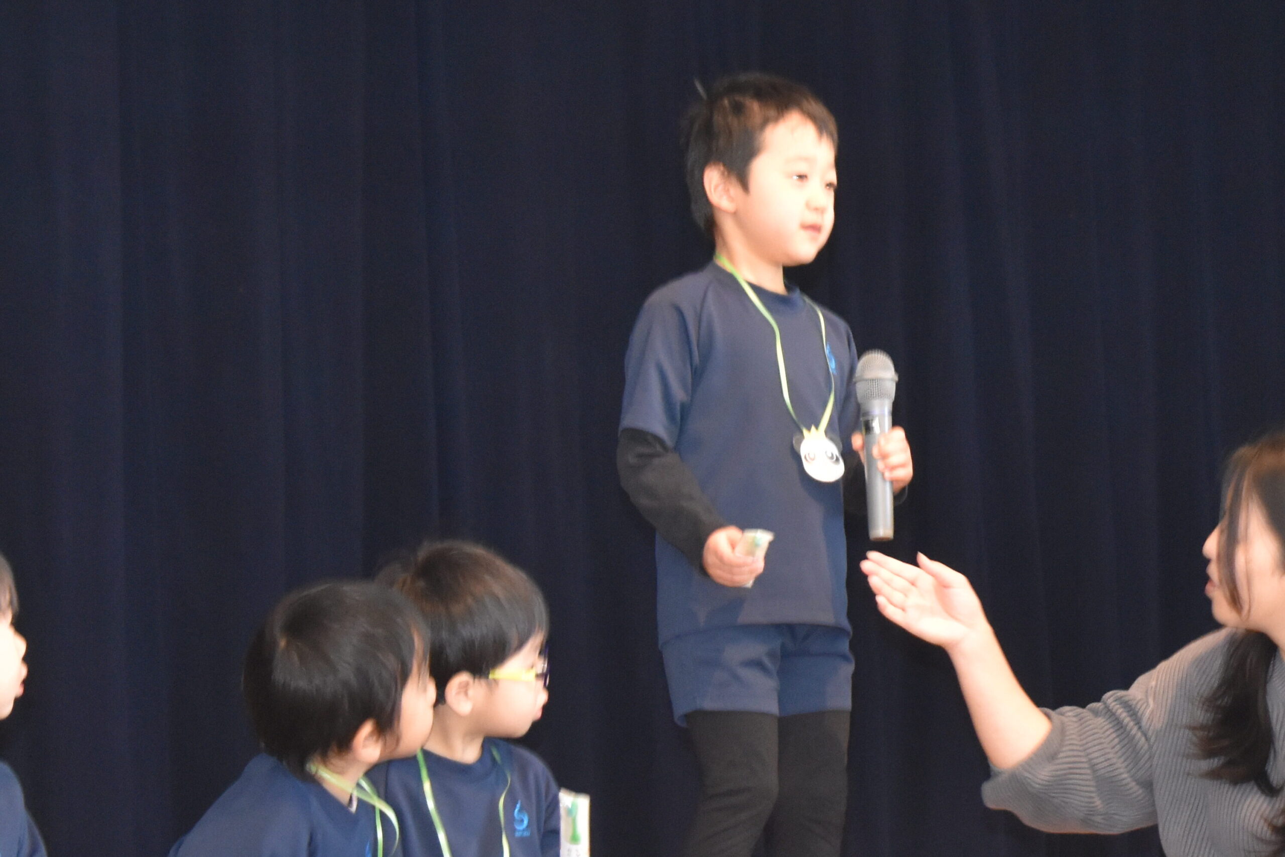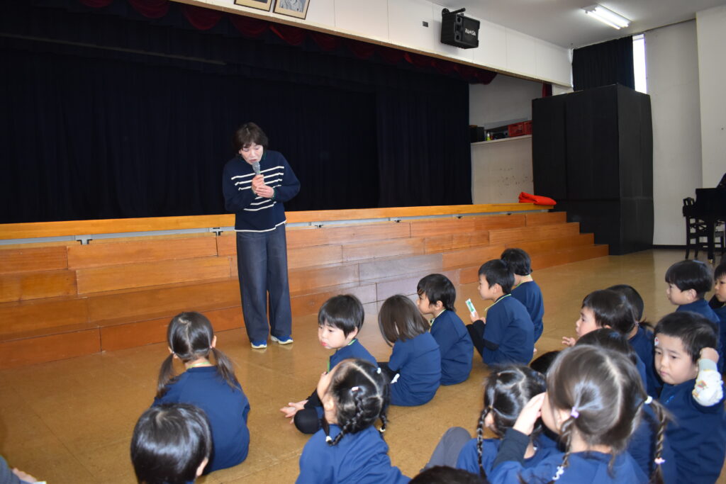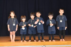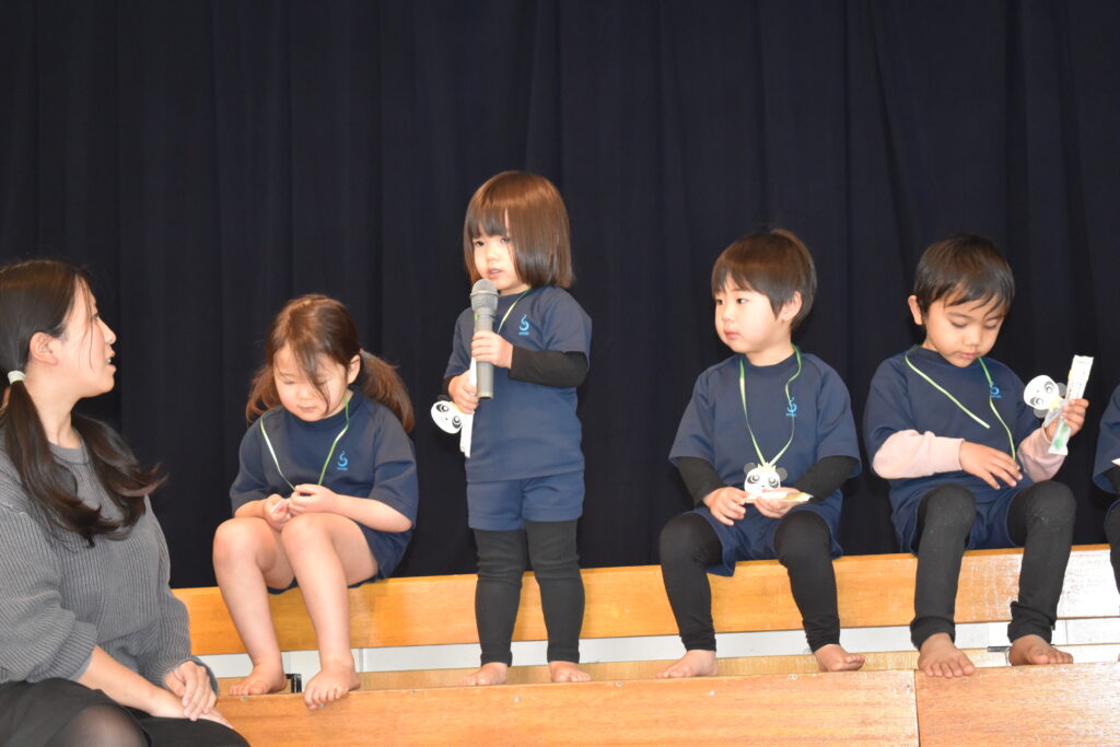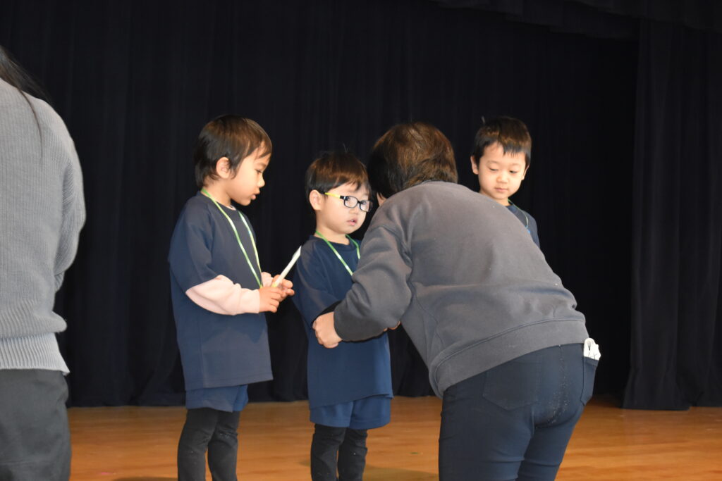 先生からプレゼントをもらい、友だちと一緒に聖徳幼稚園オリジナルの誕生祝会の歌を歌いました♪