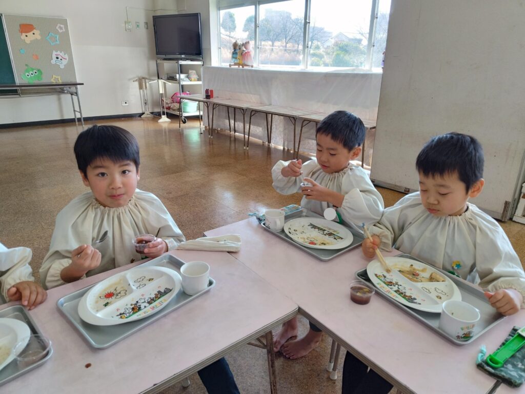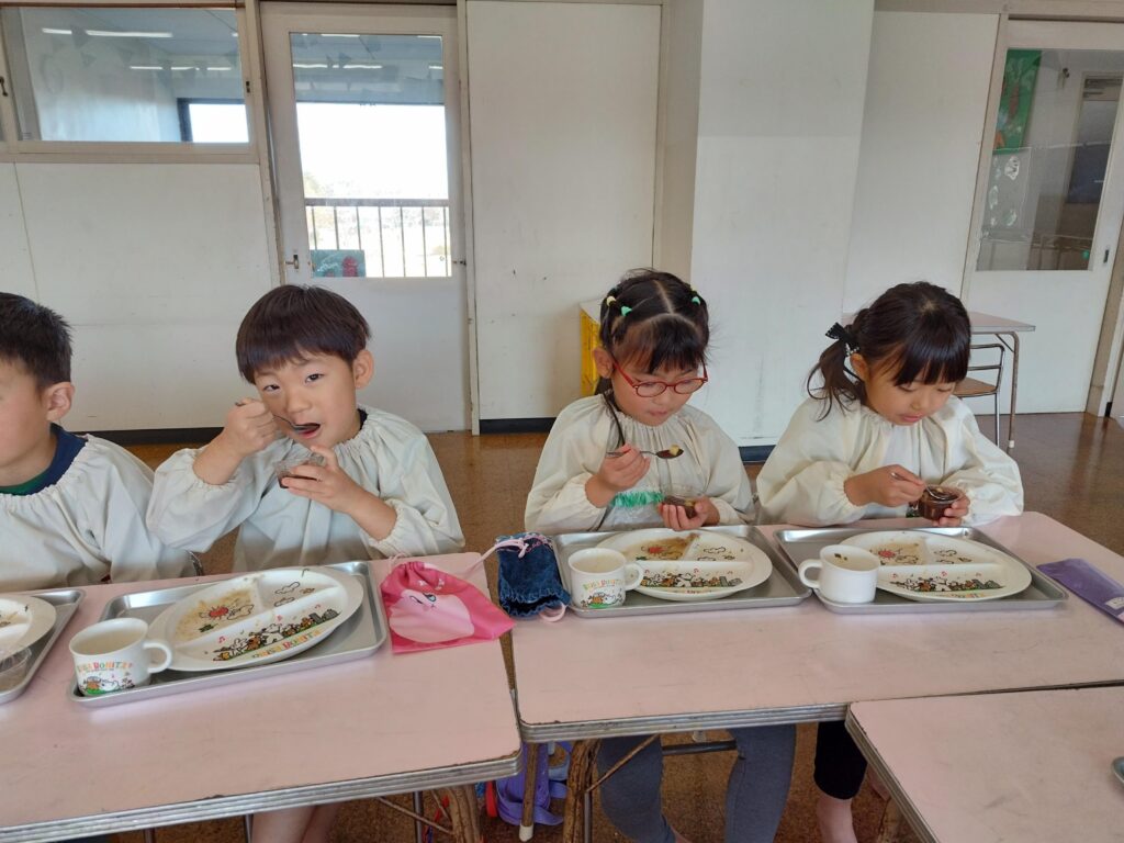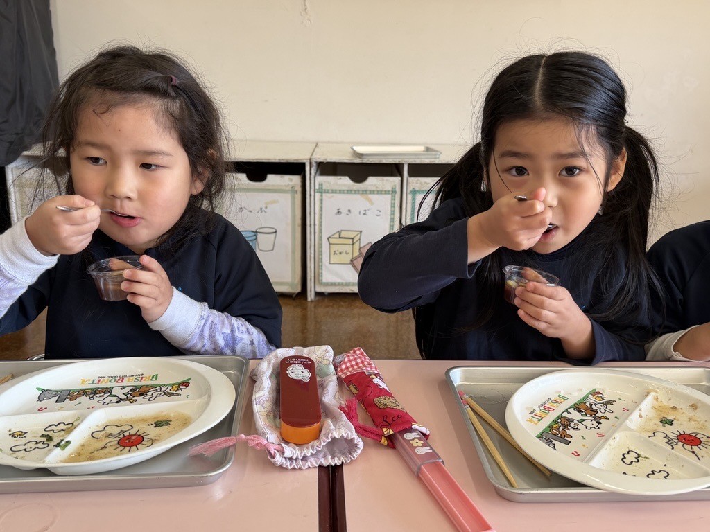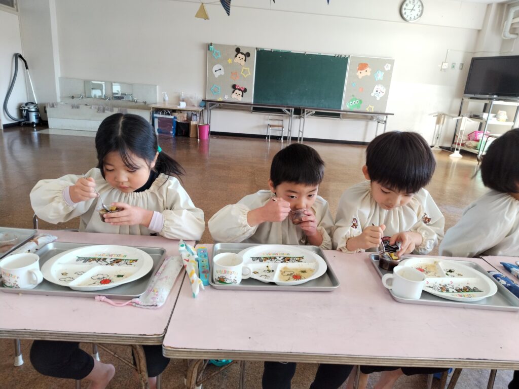 毎年1月の誕生祝会では、毎年『おしるこ会』の話を聞きます。昔々、食べ物があまり食べられなかった時に、学園の創立者川並香順先生と孝子先生が、子ども達におしるこを食べさせたことから、おしるこ会をしています。「甘いおしるこを食べて大きくなれるように」「優しい気持ちを忘れないように」という願いも込められています。