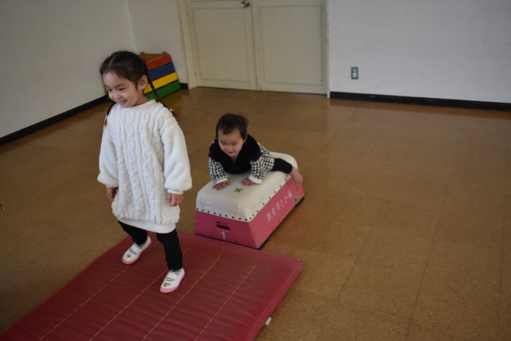 運動遊びは体育遊具の跳び箱やけんぱリングなどを使って、身体をたくさん動かしました😊