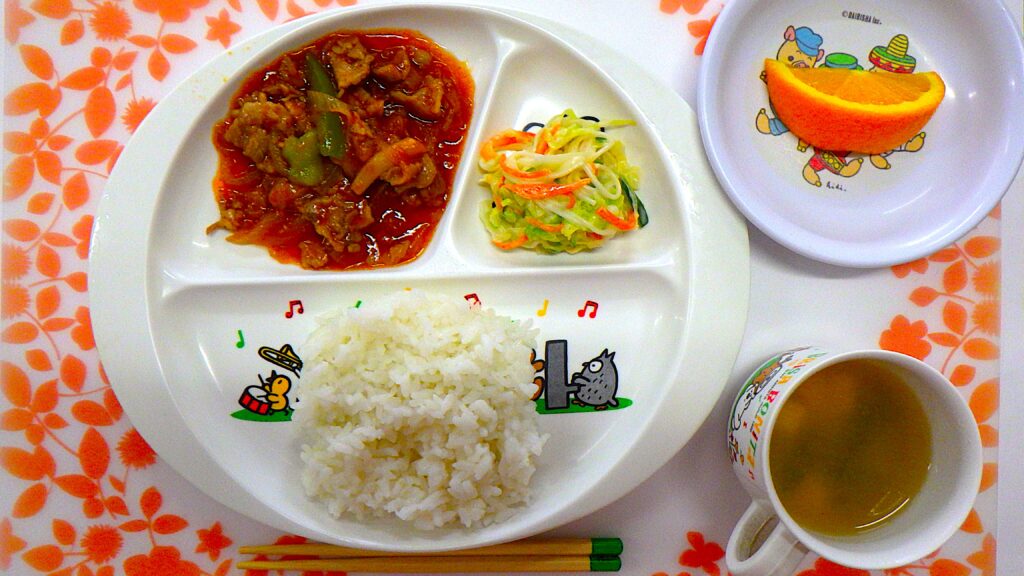 2/16 🥬ご飯・わかめと豆腐の味噌汁・ポークケチャップ・素麺サラダ・オレンジ🥬