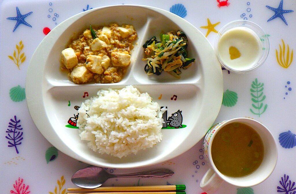 2/26 🍄ご飯・中華風コーンスープ・麻婆豆腐・小松菜とえのきの中華風和え物・ピーチヨーグルト🍄