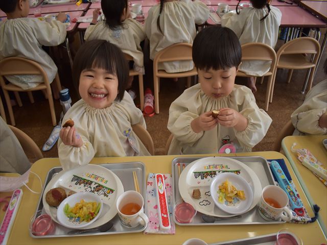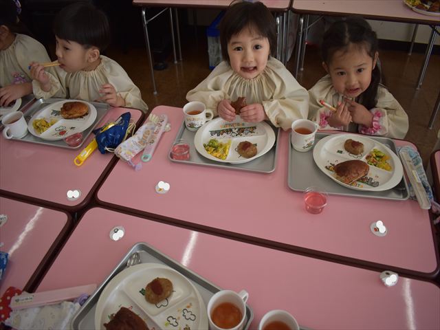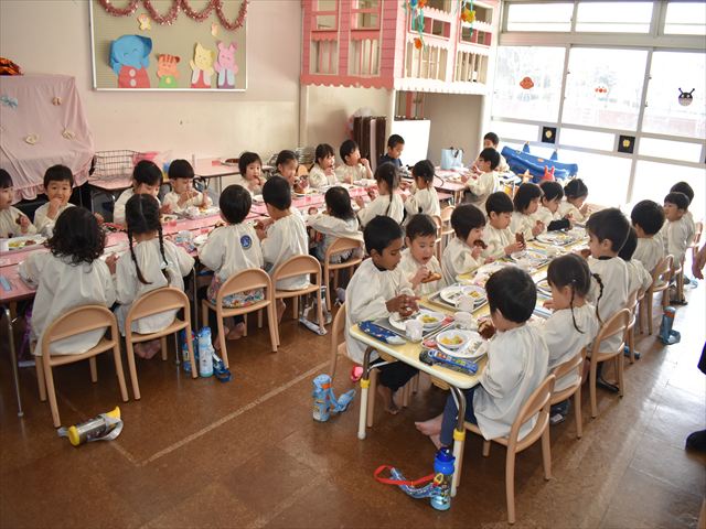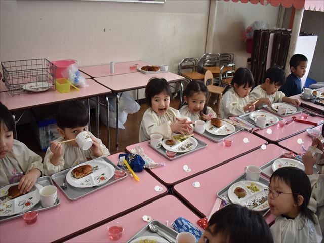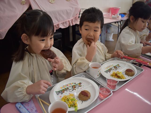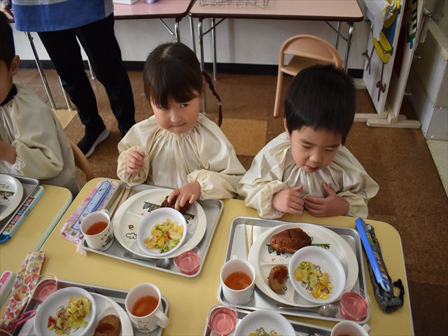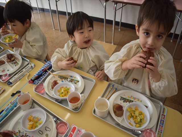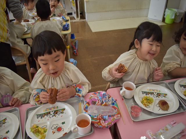 満3歳児・年少組の子ども達は、入園したばかりの頃、自分で食べられなかったり、好き嫌いがあったり、箸を持てなかったりと食事のマナーも身についていませんでしたが・・・今では、自分で箸を持ち最後まで自分で食べています🥢