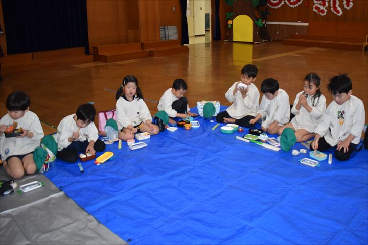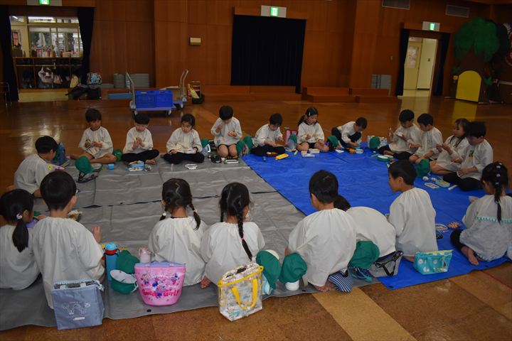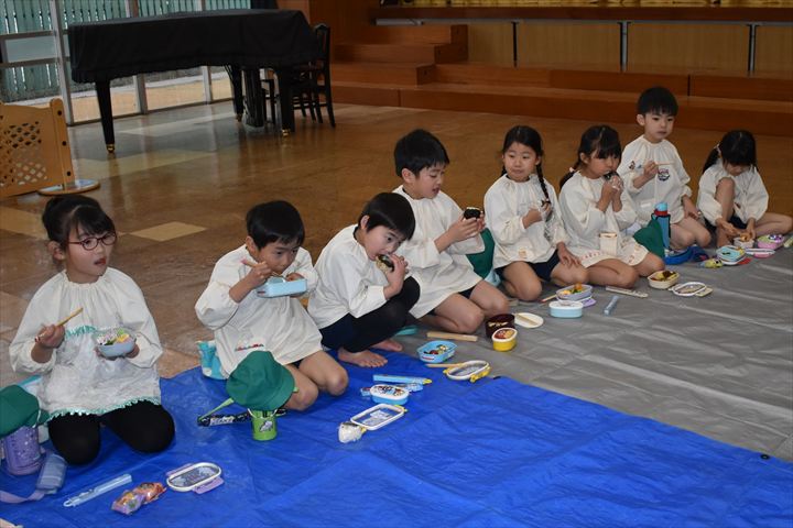 みんなで大きな輪になって、おうちの方が作ってくださったお弁当を美味しくいただきましたね。