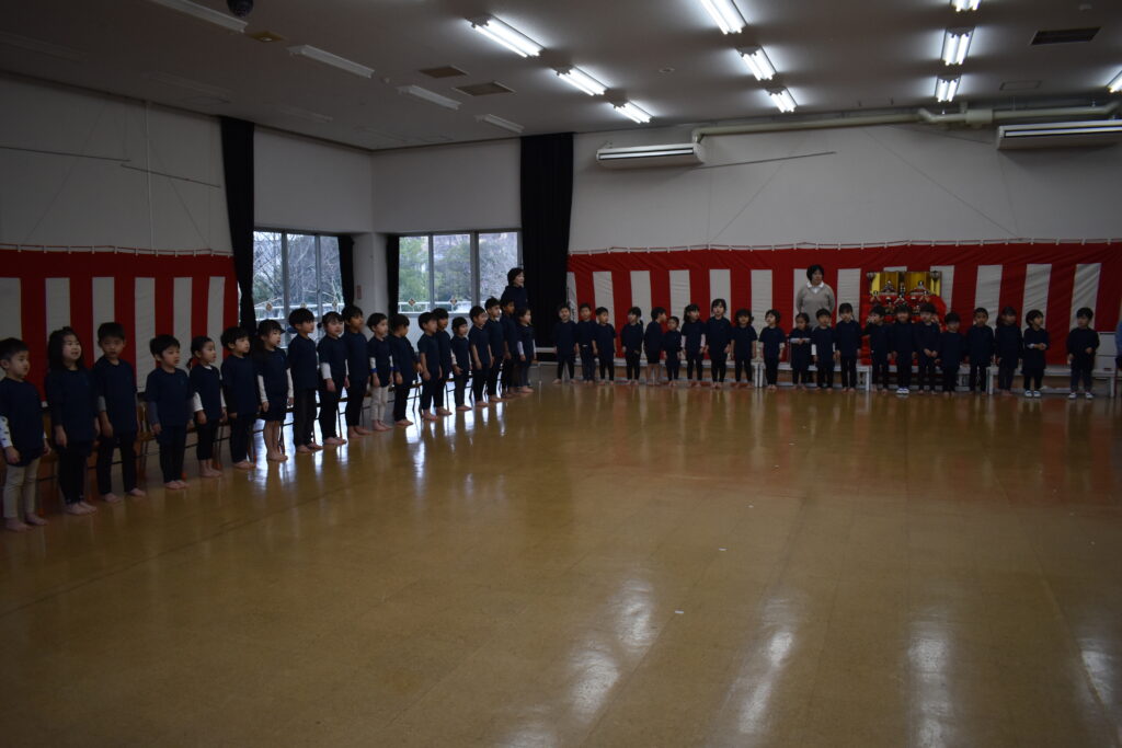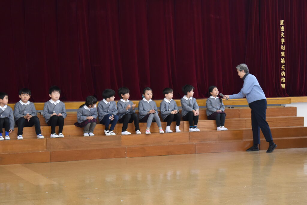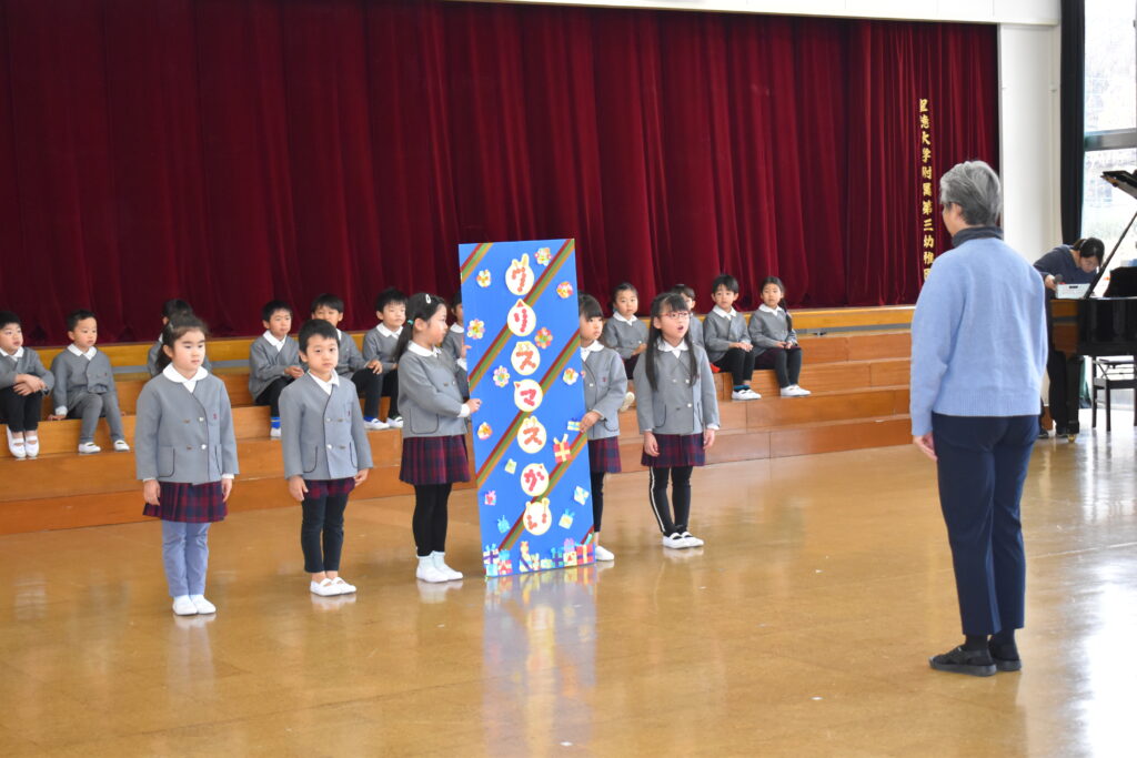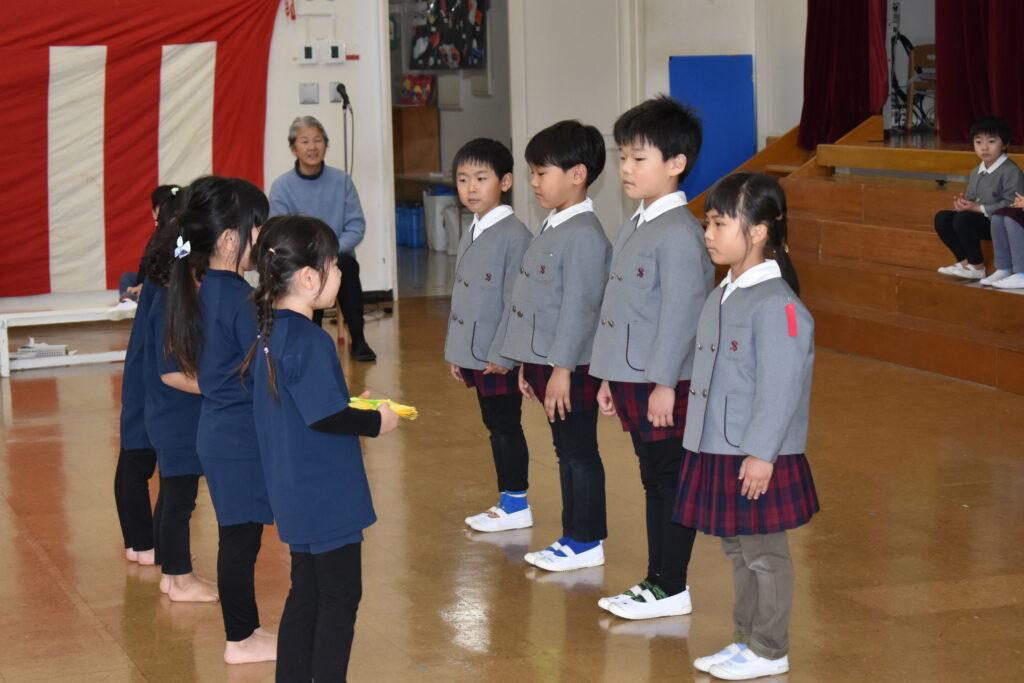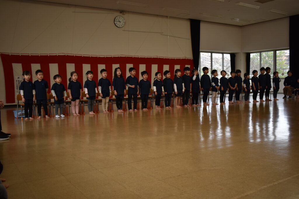 歌や踊り、時間割ホルダーやクリアファイルのプレゼントをしましたよ🌟その他に、園長先生のお話を聞いたり、幼稚園のお友だち全員で歌も歌いました🎵