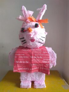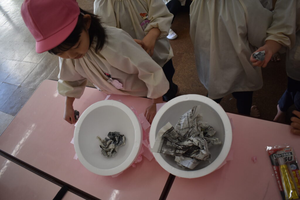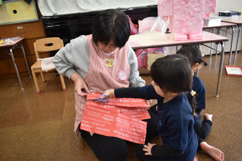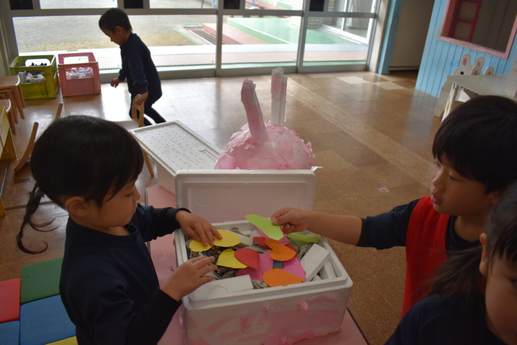 「頭には、脳みそ入ってるよ」「体にはココロを入れよう」「優しい気持ち入れたよ」などと言いながら、新聞紙やハートに切った紙を入れたり、破いたピンクの紙をのりで貼り付けたりして・・・どんどんうさぎの形になっていきます。体が出来上がると今度は、「洋服着せる?」「リボン!」などと装飾もして・・・ついに完成しました😊