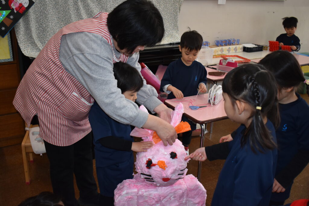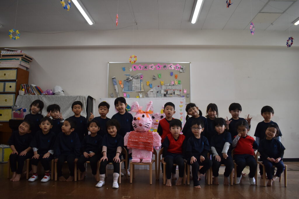 1月30日(金)の総合発表会『たのしみまショー』で、クラスの友だちと大きなうさぎを作りました🐰