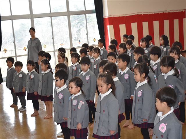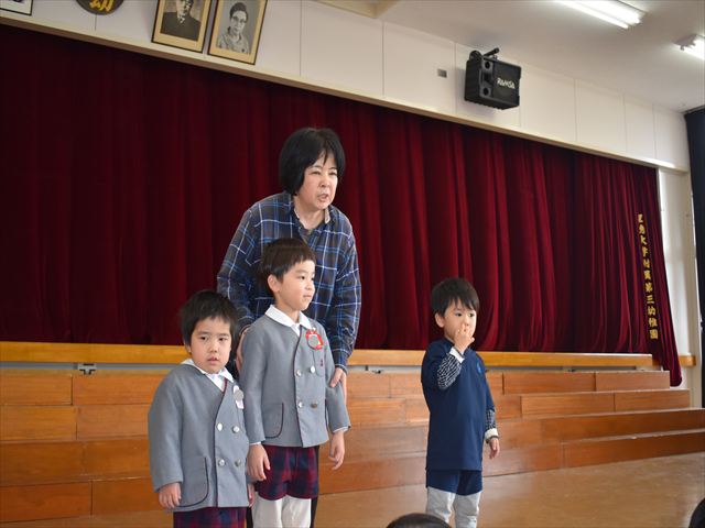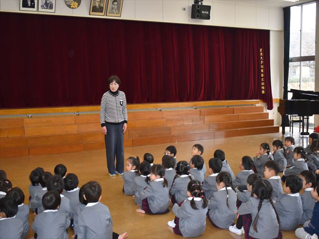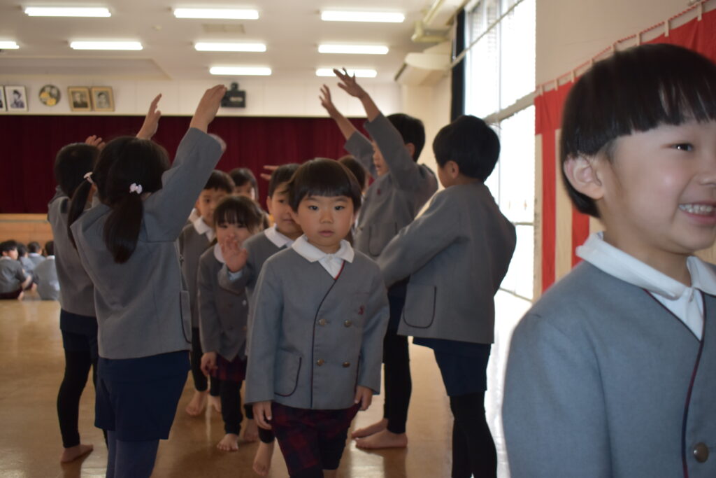 入園・進級してから1年が経ち、しっかりお話も聞けるようになりました。広瀬先生の話を聞いたり、♪園歌や♪思い出のアルバムの歌を歌いました🎵
