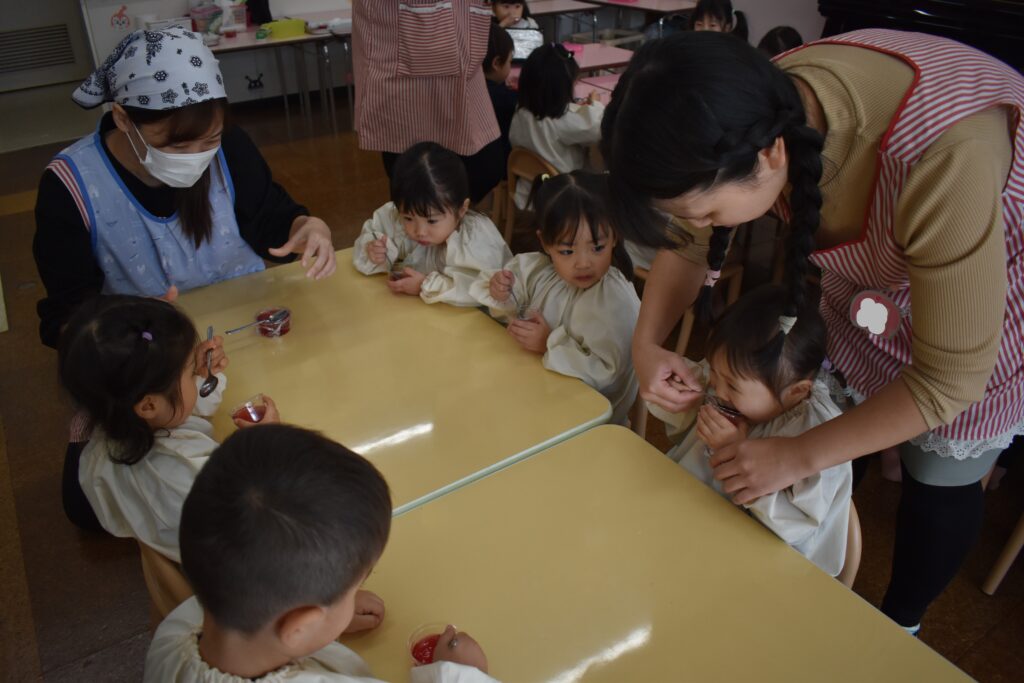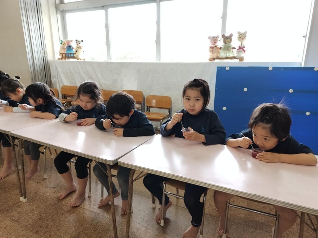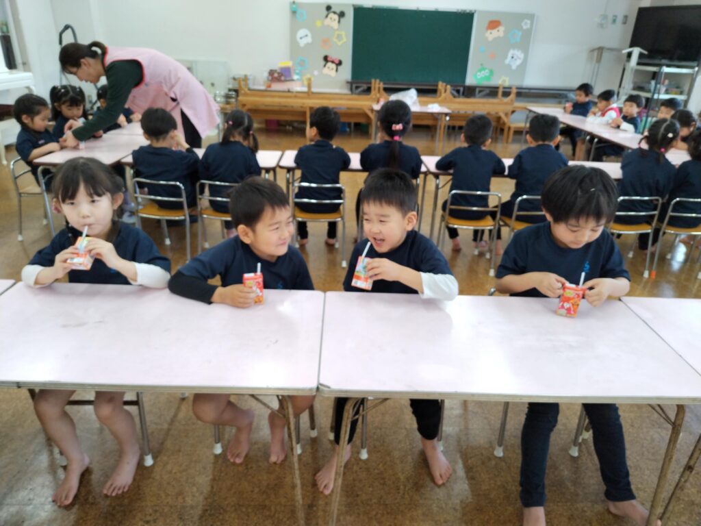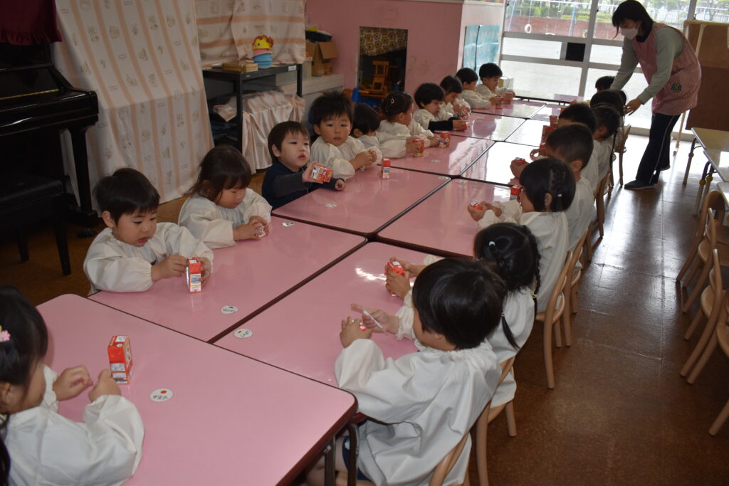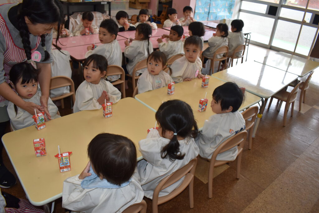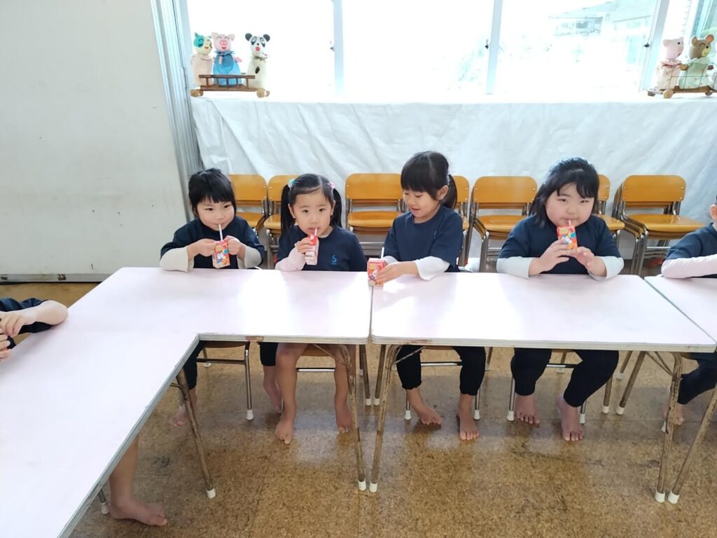 そこで、ならし給食として、おやつをいただき、給食の準備の仕方や挨拶、食事のマナー…などを覚えられるようにします🌈