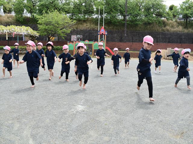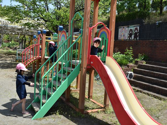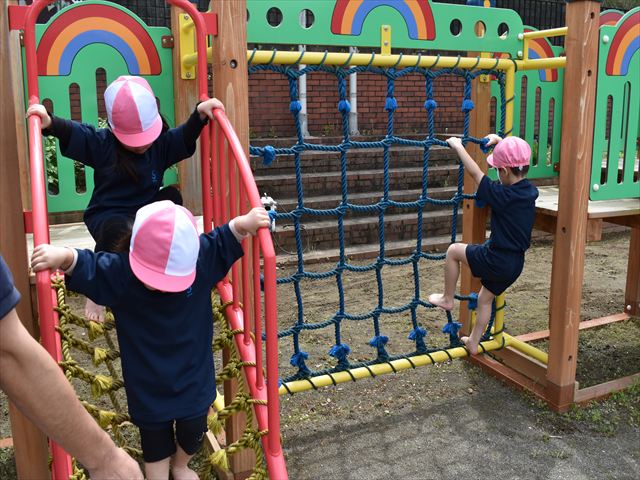 満3歳児・パンダ組、年少・桜組の子ども達は、元気いっぱいお外で遊んでいます🌈